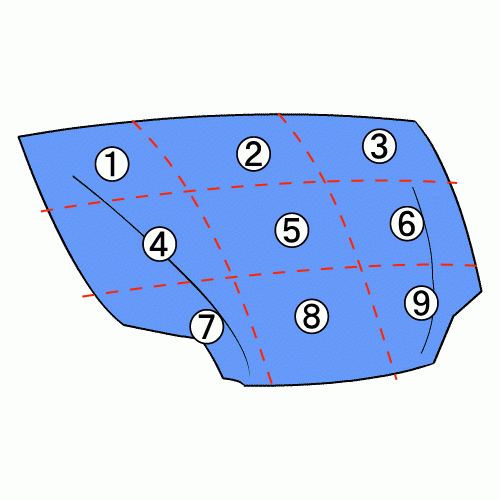 | [2、擦り傷、B 8cm×8cm][5、へこみ、B 4cm×4cm][、飛び石、ペン先、ハリ先程度] | |