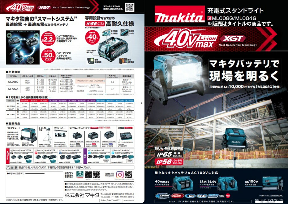 マキタ makita充電式スタンドライトML008G本体のみです。※バッテリー・充電器は別販売品です。88381768238■最大光束10,000lm、40Vmax仕様充電式スタンドライト■LEDライト光源96灯輝度切替3段階。■様々なマキタバッテリに対応40Vmax・18V・14.4Vバッテリも使用可能(ライトバッテリ除く。バッテリの2本同時使用可。バッテリは別売です)。■AC100V電源も使用可能■電源コードは本機に収納可能■防じん・防水保護等級IP65対応※バッテリ使用時。 粉じんや水による影響を受けにくいように設計されていますが、故障しないことを保証するものではありません。■ライト角度調整240°■バッテリ切れ時は1灯に減灯してお知らせ■折り畳み式キャリングハンドル■防眩フィルム(標準付属/1枚入)ライトが眩しい場合に使用。