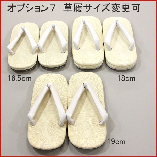 | 草履の交換 | ■草履は、16.5cmもしくは19.5cmに変更することができます。 ※草履は、靴と異なり、足のサイズにあわせる必要はございません。 草履サイズより0.5cm程度大きくても着用できます。 ※ご要望のお客様は、「フォーム備考欄」「メール(aji_net@khaki.plala.or.jp)」「お電話」「FAX」いずれかの方法でご連絡ください。 |
