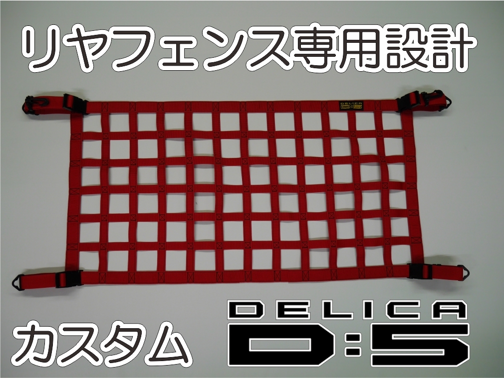| 三菱 デリカ D:5 オリジナル リヤフェンス専用カーゴネット DELICA レッド リヤの床・側面にはフックポイントも複数あり これを上手く活用していますか? 『そこで荷物の目隠しにも効果があるリヤフェンス専用ネットを設計で作りました。』 □デリカのリヤフェンス上段と床にあるユーティリティフックを利用するネットサイズで設計製作しました。 □素材のベルトはPPテープ仕様で2種類の厚み・幅の3タイプのネット構成 ・幅20mm/厚1.2mmテープ ・幅30mm/厚1.6mmテープ ・幅30mm/厚1.2mmテープ ネットを20mm幅で作り 周りは30mm幅/1.6mm厚+1.2mm厚のテープを使い挟み込みストレート縫+タスキ縫を強い糸で縫製しました。 工業用の厚物に特化した専用ミシンで製作しています。 □国産メーカーのプラスチックパーツを使用しています。 上側にプラのナスカン(360度回転)でフックポイントに取りつけます。 摘まんで外すバックル採用で元のテンションも簡単に掛かります。 フェンス機能で荷室の目隠し・荷崩れ効果・ドレスアップの両立 下側はDカンのみで好みのアルミカナビラを別途、用意して取り付けてください。 □オリジナルのデリカロゴの刺繍ワッペンも付けてます。 商品はオリジナルのリヤフェンス専用ネットの単体の出品です。 テスト装着を繰り返して完全オリジナルでデリカ専用のネットいかがでしょうか。 新型デリカもフックポイントが同じなので問題なく装着できます。 実用ドレスアップパーツを目指しました。よろしくお願いしますm(__)m | ||