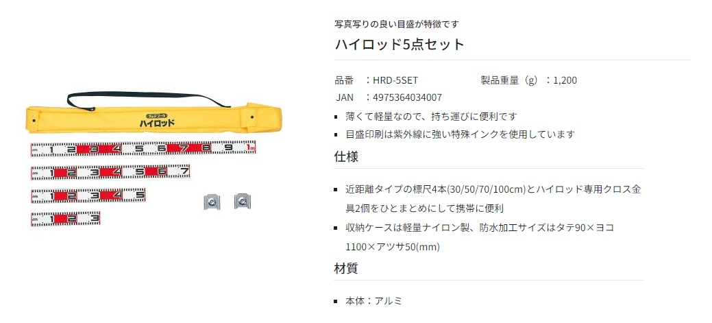 タジマ TAJIMAハイロッド5点セットHRD-5SET■特長・薄くて軽量なので、持ち運びに便利です・目盛印刷は紫外線に強い特殊インクを使用しています■仕様・近距離タイプの縮尺4本(30/50/70/100cm)とハイロッド専用クロス金具2個をひとまとめにして携帯に便利・収納ケースは軽量ナイロン製、防水加工サイズは縦90×横1100×厚さ50(mm)■材質・本体:アルミ