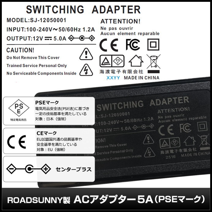 | ◇外形寸法 サイズ:約120.0×54.5×34.0mm(奥行/幅/高さ) ケーブル長(出力):約1.5m メガネケーブル長(入力):約1.8m DCジャック外径:5.5mmφ DCジャック内径:2.1mmφ ◇仕様 分類:スイッチングACアダプター 型番:SJ-12050001 出力電圧:12V 出力電流:5A 消費電力:60W メーカー:ROADSUNNY(ロードサニー) 入力端子:差込プラグ 出力端子:DCジャック ジャックタイプ:ストレート 定格入力電圧:AC100~240V 入力周波数:50/60Hz 極性:センタープラス DCコード規格:AWG20/300V/80℃ 重量(本体):約223g パイロットランプ:赤 保証:商品到着後、1年間の品質保証が付いております。 万が一品質に問題があった場合は、メールにてご連絡ください。 | |