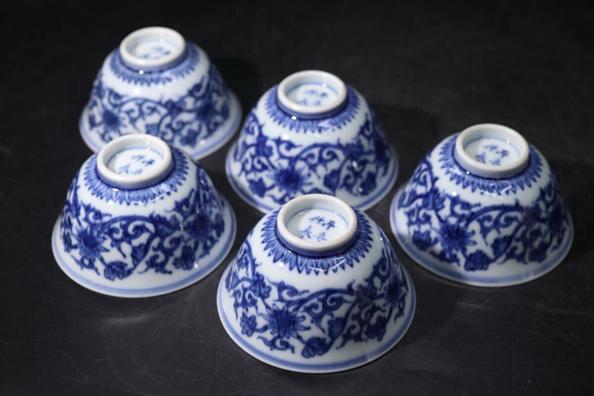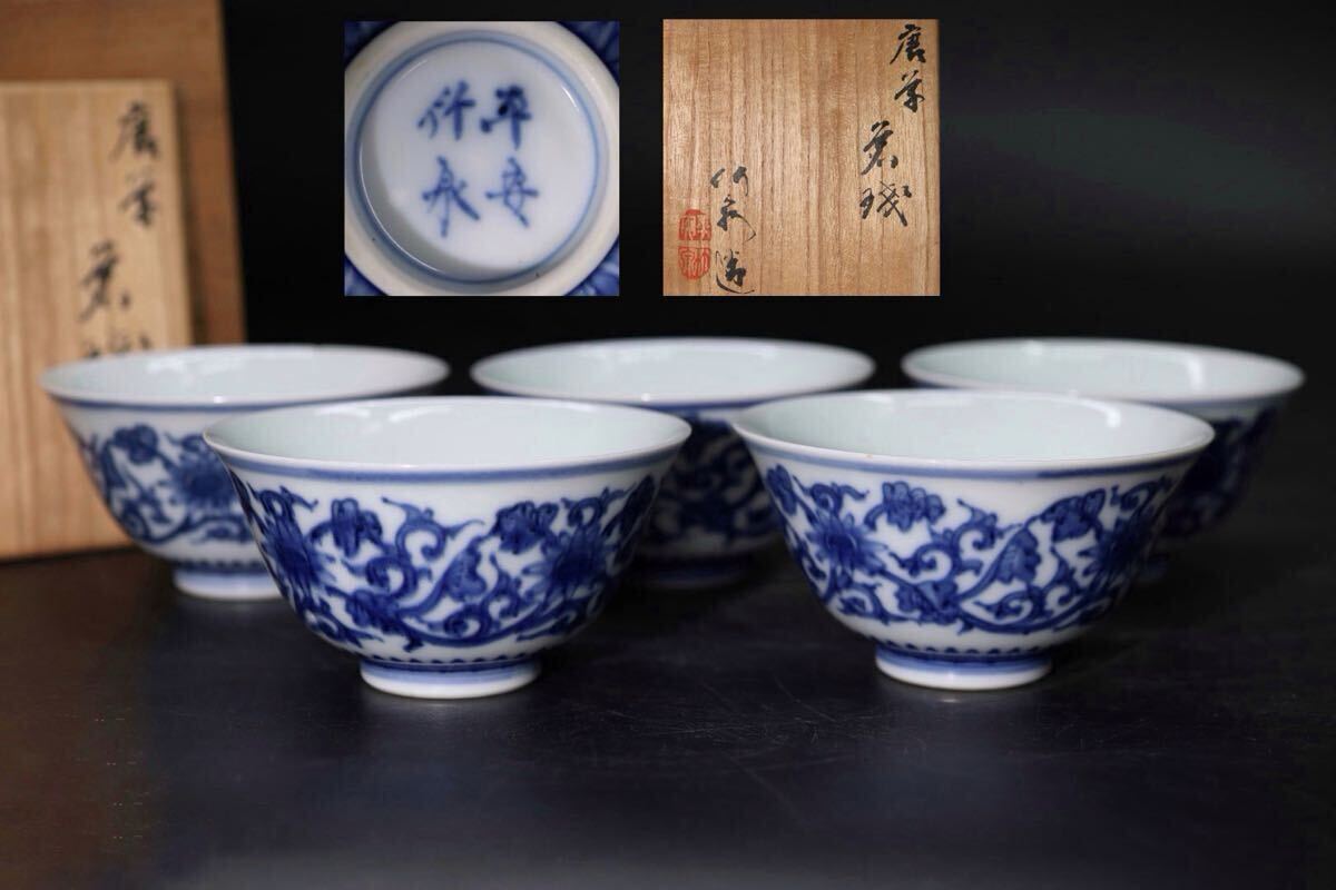 | 平安竹泉 造 「 染付 唐草 茶碗 五客 」 共箱付 / 竹泉 京焼 清水焼 煎茶碗 茶器 煎茶道具 .G2057 |