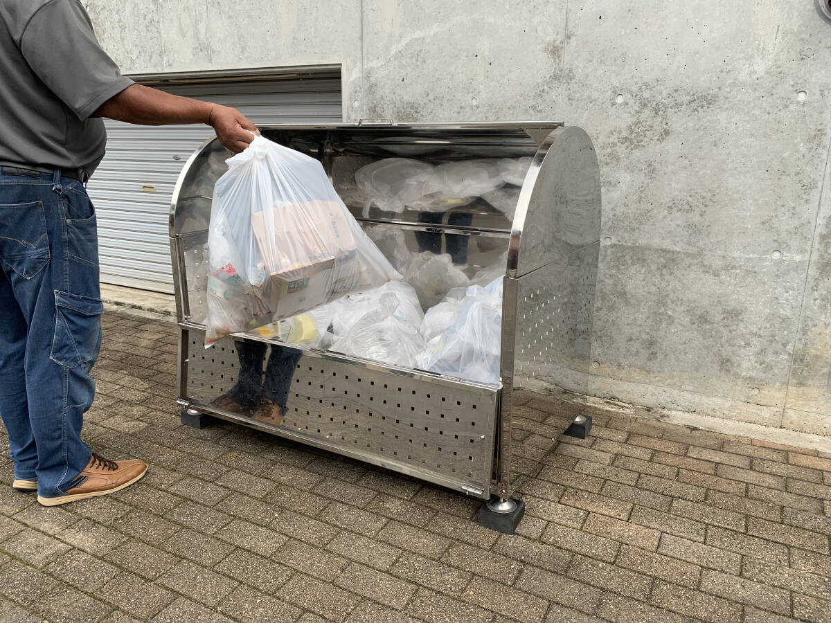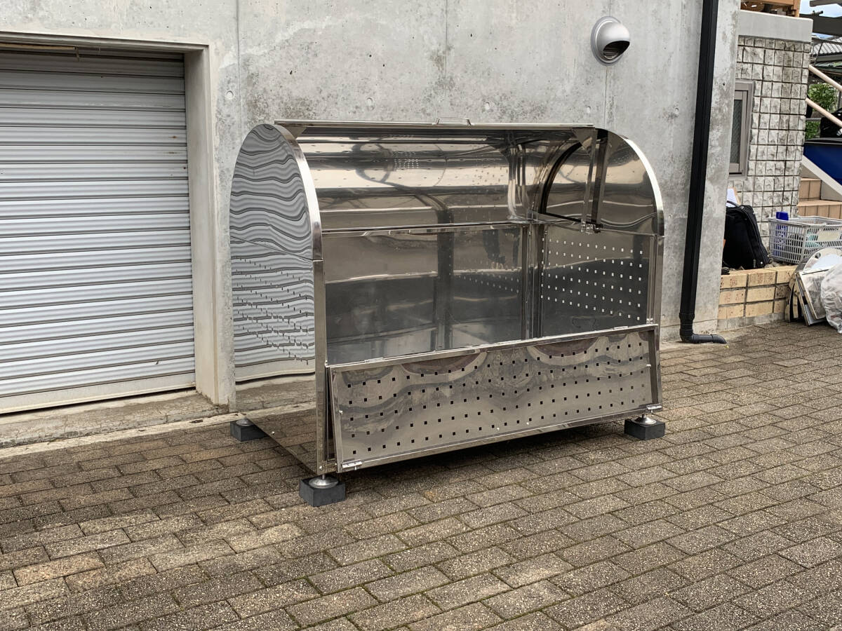 | 商品説明 | ※商品説明動画付き!店頭お引渡し限定!!組み立て済 サンプル完成品 幅1300mm SUS304製 ステンレスアーチ型 大型ごみ箱 大容量970L アーチオープン 環境美観 ゴミステーション ゴミ箱 自治体 町内会 アパートマンション 二世帯 オフィス 公園 野生動物 クマ サル イノシシ 猫 ネズミ侵入対策などに などに ※当方の工場にて商品を組み立てしてからお渡しする商品です。ほぼ未使用の組み立て済み商品ですが、多少の擦れ等がある場合があります。 ※当方、インボイス対応業者になっておりますので、商品の購入に関する補助金申請に必要な領収書等を発行することが可能ですので、お買い上げ後、お申し付けください 【商品説明】 ●鏡面 輝きのあるSUS304製 ステンレス材質!防錆性、デザイン性に優れた、アーチ型ステンレス大型ダストボックス ゴミステーション 非接触型 環境対応設計 ●衛生的で、街並み、玄関先、アパート、集合住宅、オフィス会社、公園、施設などの美観を損なわない清潔で衛生的なステンレス製 ●組み立て済み 完成品 耐久性 防さび性に優れたSUS304製ステンレス材質 見た目もよく、環境に対応した衛生設計 ●開口部は、大きく開くアーチ型手持ちハンドル付き。ワイヤーロックやダイアルロックなどがかけられる設計。(商品1個に付きダイアル4桁の暗証番号設定可能の南京錠付き) ●ボックス内へゴミを出した後に、ネズミ、カラス、猫、クマ、サル、イノシシなどの野生動物や小動物の侵入を防ぎ、関係者以外からのポイ捨てを防ぐ、ダイアル4桁暗証番号付きカギ付き防犯対応設計 ● 本体下側には高さ8cm~10cmほど調整できるネジ込み式ステンレス皿の土台が付いておりますので、本体設置の際の水平を保てる安心設計です。 ●さらに、本体の設置時に高さを保ち、商品底面に衝撃擦れキズを防ぐための硬化ラバーゴムタイプの角型ブロック4個を付属します ●他の方が収集したごみに触れることなく、前面の開口部だけが1/2部分が開閉できる設計で、大きなゴミでもかんたんに収集が可能。ゴミ回収業者様や、住民の方がゴミを出される際にも最低限の労力で、開口部は軽々オープン、ゴミ出しがとてもラクラクで便利な設計 ●底面と、サイド面の壁部分には悪臭対策や、湿気、通気性対策に優れたパンチングの通気穴開き設計。ゴミボックス内に異臭や、生ごみなどのイヤな臭いが残ることがありません ●前面扉の開閉ができる設計で、上段の扉を開ける際には開閉時、折りたたみ時に起きる、扉との干渉の音防止、衝撃防止などを考慮した防音、衝撃吸収ゴムラバー付き設計です ●ボックス自体を水洗いなどで掃除をする際にフロント部分の扉上部が開けられる設計で、底面にもパンチング穴が開いておりますので、定期的な清掃、水洗いや、ボックス内の掃除、汚れの洗い流し洗浄がスムーズにできます ●油分の汚れや、食べ残しのゴミがこびりつきにくい表面ステンレス設計。長い間の使用で常に美観を保ち、劣化やさびなども出ない耐久性のあるSUS304製ステンレス材質 ●大容量 おおよそ 970リットルの収容量 45リットルのゴミ袋がおおよそ20個~21個ほどが収容できる大容量サイズです。 自治体 町内会 アパート マンション 2世帯住宅 工場 会社 オフィス 公園などにぴったりの設計デザインです ●商品は、店頭お引渡し限定になります。商品発送をご希望の方は、別途、商品ページにてお買い上げください。商品表面にはサンプル品以外は保護フィルムが貼り付けしてあります。ドライヤー等で温めながらゆっくりとはがして完成です。 【寸法 スペック参照】 ※幅 1300mm ※高さ 本体底面から 1000mm ※奥行き 700mm~750mm ※重量 約 50kg 付属品除 ※ステンレス 厚み 約 1.0mm ※内容量 約 970リットル