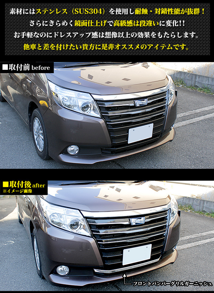 | 車種専用設計で取付け楽々! 煌めく鏡面メッキがラグジュアリーかつ高級感を演出。 ドレスアップ効果抜群のアイテムです! ■適合:ヴォクシー 80系 Vグレード ZRR80G/ZRR85G/ZWR80G 【H26.1〜H29.6】前期専用 ■サビに強いSUS304ステンレス製 ■表面パフ仕上げで煌めき抜群の鏡面仕上げ ■3D立体プレス成型品 ■両面テープ装着済み ■セット内容:フロントバンパーグリルガーニッシュ 6P |