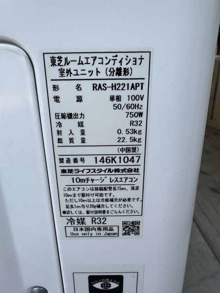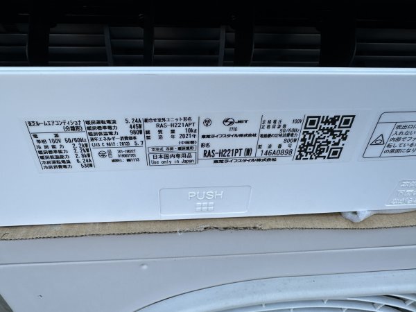 東芝 TOSHIBA 大清快 2021年 2.2kw 6畳用 冷暖房 ルームエアコン RAS-H221PTです。
