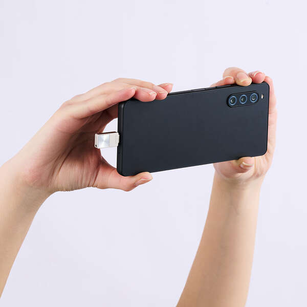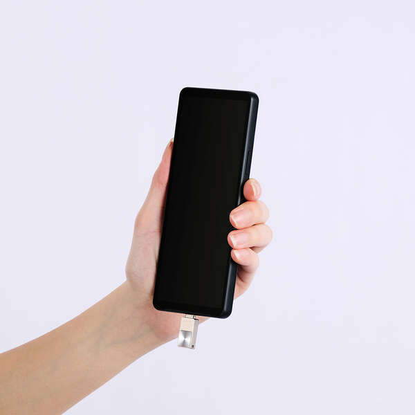 | ●本体は全長約2cmで、挿したままでもスマホ操作の邪魔になりません。 時間のかかるバックアップの間も、挿しっぱなしで使えます | |