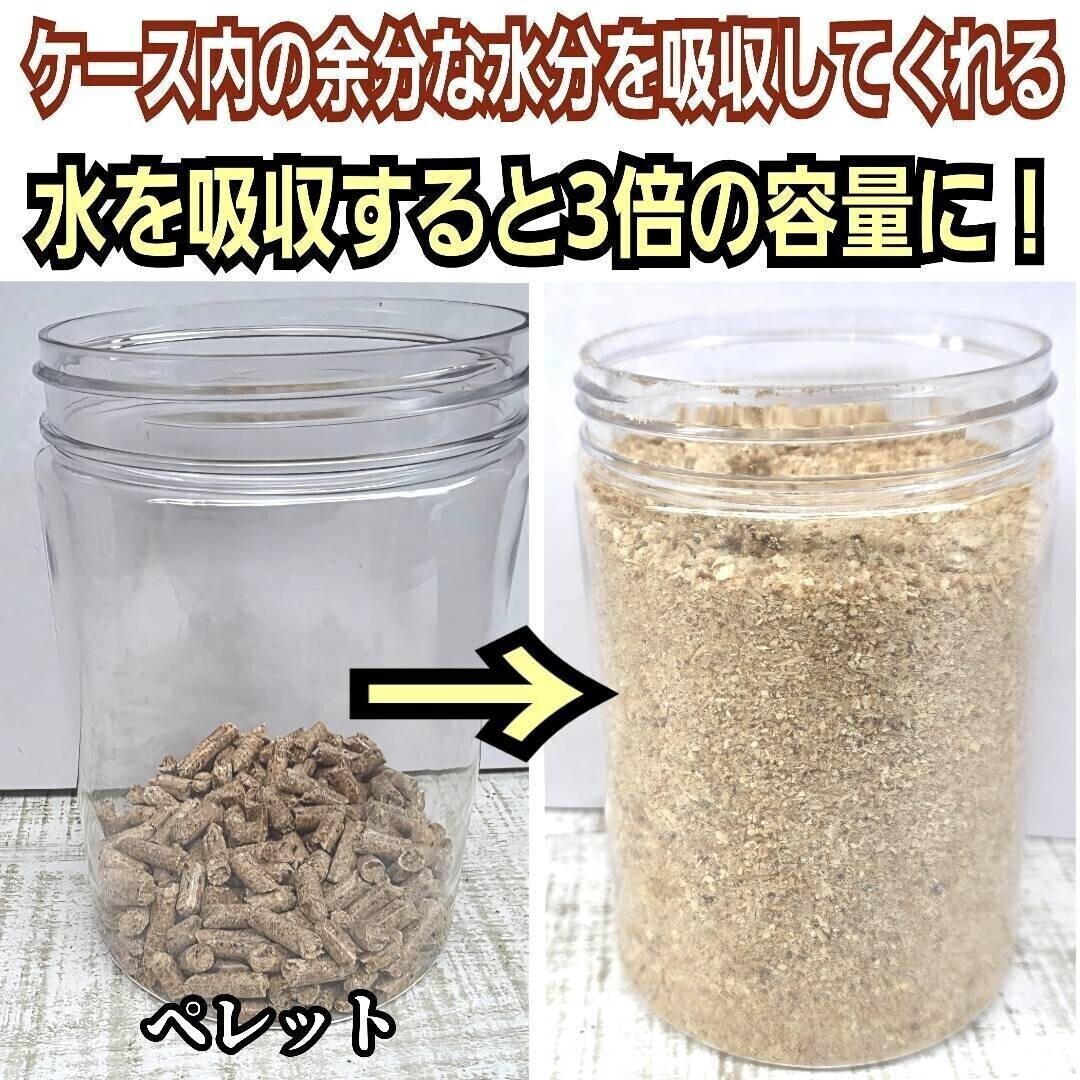 無農薬の国産針葉樹のみを粉砕してあるのでカブトムシ、クワガタ には無害で安心してご使用できます。 針葉樹の持つ防虫、抗菌、消臭効果抜群です。 成虫管理には是非お勧めです。 見た目もきれいで衛生的にクワガタ、カブトムシの成虫管理ができます。 「フィトンチッド」などの天然成分が、雑菌の繁殖やカビの発生を抑える効果があります。 弱殺菌処理でクワガタ、カブトムシに有害な成分を除去までしてくれるのです。 木の自然な香りがあり、部屋の中でも使いやすいです。 消臭効果もあり清潔な環境を保ちます。 ペレット状なので保管や交換が簡単。崩すとおがくず状になります。 また、ペレットは余分な水分を吸収してくれます。 水分を吸収すると画像のようにマットがパウター状になり3倍の容量に増えます。