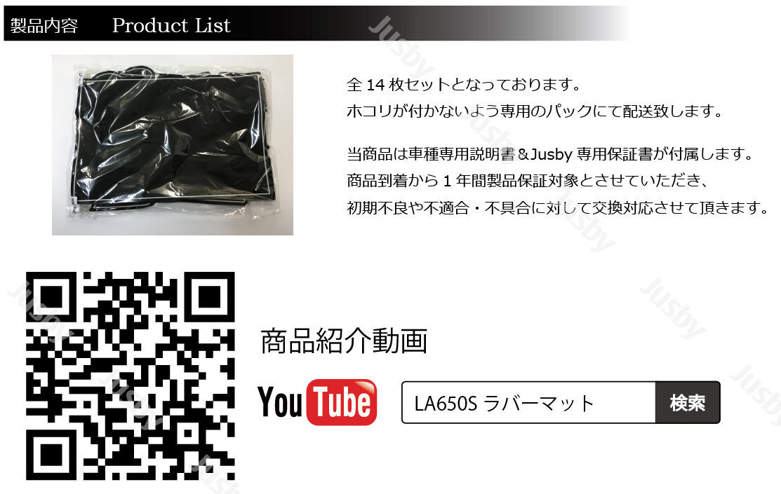 | ・専用ラバーマット 14枚セット ・車種専用取り付け説明書 ・保証書 |