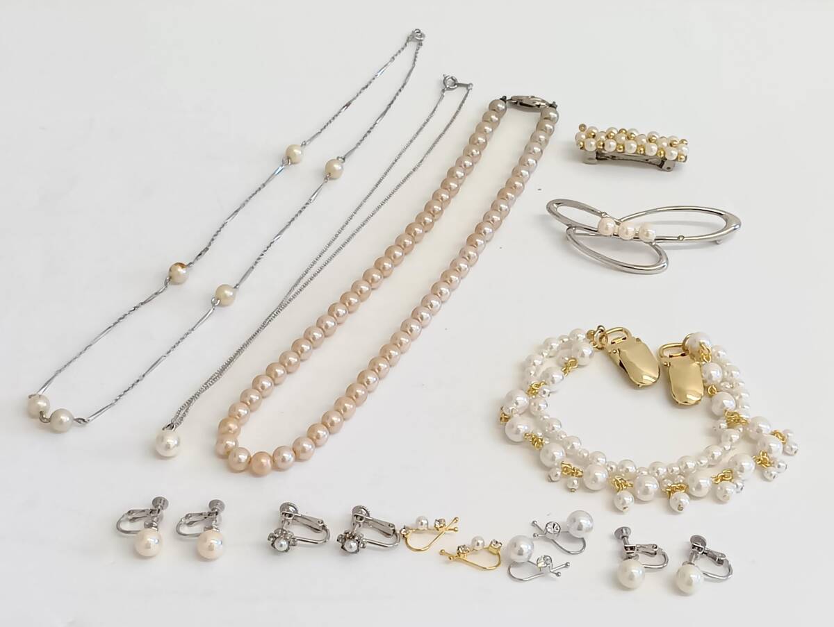 | ☆フェイクパール アクセサリー まとめ11点 ネックレス ペンダント ブローチ イヤリング ショールクリップ イミテーション アンティーク |