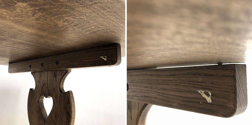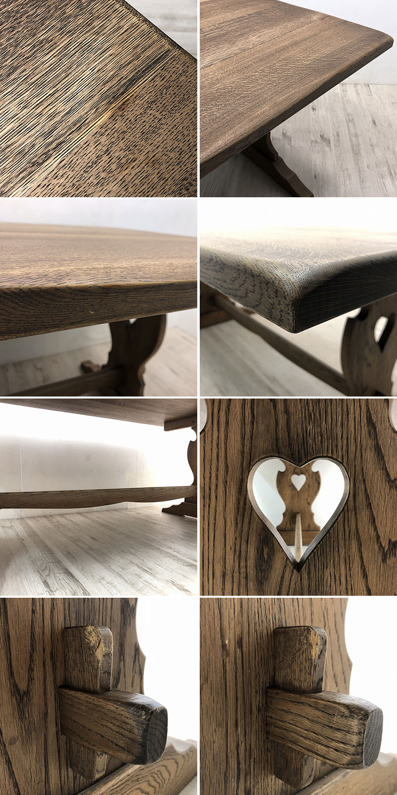 こちらは豊田たんす オーク材 ダイニングテーブルです。 中古品です。 オーク無垢材を贅沢に使用した温もりあふれるダイニングテーブルです。 長方形の天板と左右の太い脚2本、脚には補強横木が渡されているこちらのデザインは、 リフェクトリーテーブルとも呼ばれ、ヨーロッパでは定番のダイニングテーブルの一種です。 頑丈で重厚さのある造りに加え、脚には装飾が施され、アンティークアイテムとも 大変相性が良く人気のお品です。 ![]() こちらに使用しているオーク材は柾目で製材すると虎斑(とらふ)という虎の背中の縞模様に似た美しい杢目が現れ、 個性豊かな表情を楽しめます。 ひとつとして同じものの無い、天然木の証です。 【豊田たんす】 名古屋の家具通りとして名のしれた裏門前町通りに、高麗屋から1927年に独立し、 「高麗屋豊田たんす」の名で家具店を創業したのが始まりです。 オーク材をふんだんに使用した高品質なハンドメイド家具専門店です。 残念ながら2018年に閉店されましたが、まだまだ根強いファンが多く、 現在では中古市場でしか手に入れることが出来ない為、希少性も高まり人気を集めています。 【コンディションについて】 多少の使用感や小傷があります。 天板裏の脚を取り付けるパーツの木ネジが1部代替品です。 ![]() 天板とパーツに少々隙間が開いております。 脚は外した状態で発送いたします。(組み立てには六角レンチが必要です) 詳細につきましては下記画像も合わせてご参照ください。 ![]() 再良市場の他のお品物はこちらから!