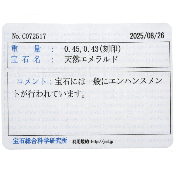 | 石目 | エメラルド0.45ct ダイヤモンド0.43ct |
