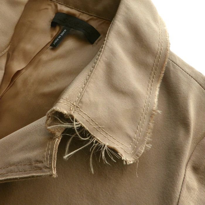 | ジルサンダーのポリエステル×シルクを使用したジャケット。 シャツの様に羽織れるライトアウターです。 襟部分が大胆にカットオフ仕様となっておりカジュアルよりなディテールです。 ややピンク味のあるベージュのお色味で春夏はもちろん、差し色としても重宝します。 ハリのある生地感とウエストのシェイプが見事にマッチし、ラグジュアリー感のある一着です。 |