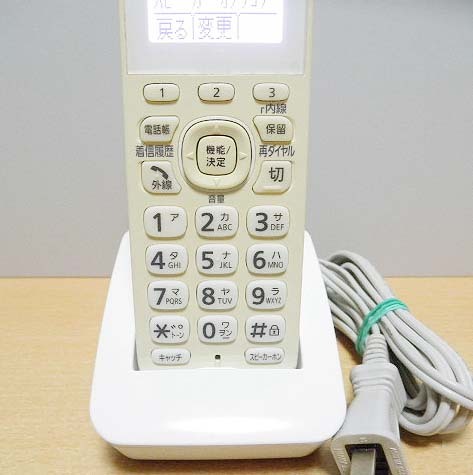 子機本体、充電台、充電池(社外品新品)。親機に接続して通話確認。すべてのボタンの反応を確認しましたがすべての機能を試したわけではありません。全体的に日焼けでクリーム色になっています(写真参照)。中古経年品につき現状渡し。落札後のキャンセルやクレームはお断りします。