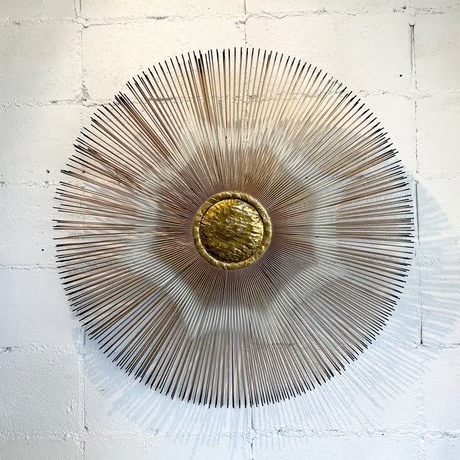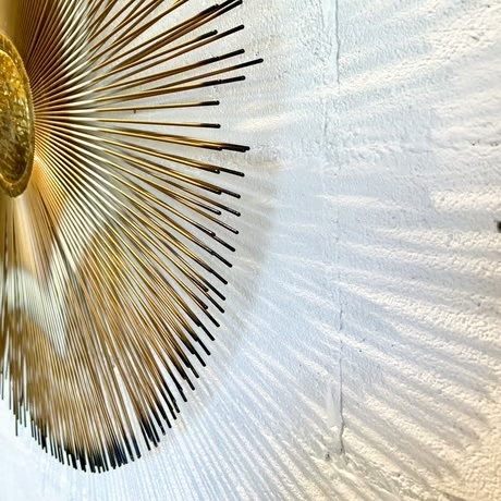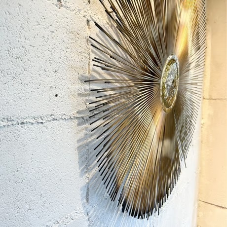 1970 年代の Casa Devall手書きサイン入りアートです。 中央の凹凸加工された真鍮の装飾から伸びる 2 層の真鍮棒でできています。 ハリウッドリージェンシースタイルの壁掛けアートです。 影も芸術的です。 モダンなリビングに是非。 | 出价者 | 信用 | 价格 | 时间 |
