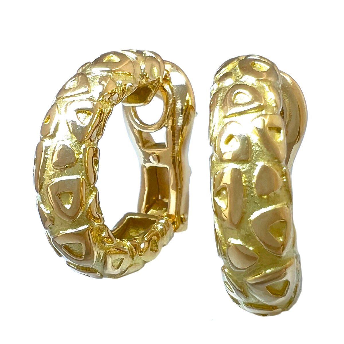 | ブランドコメント | 240年以上の歴史を持つフランスの老舗高級ブランドCHAUMET、ショーメ。 幾何学模様で豹柄をデザインしたフープピアス、カロス。 艶ありの表面に、マット加工が施された梨地仕上げの彫り込み模様が芸術的なヴィンテージフラップピアス。 |