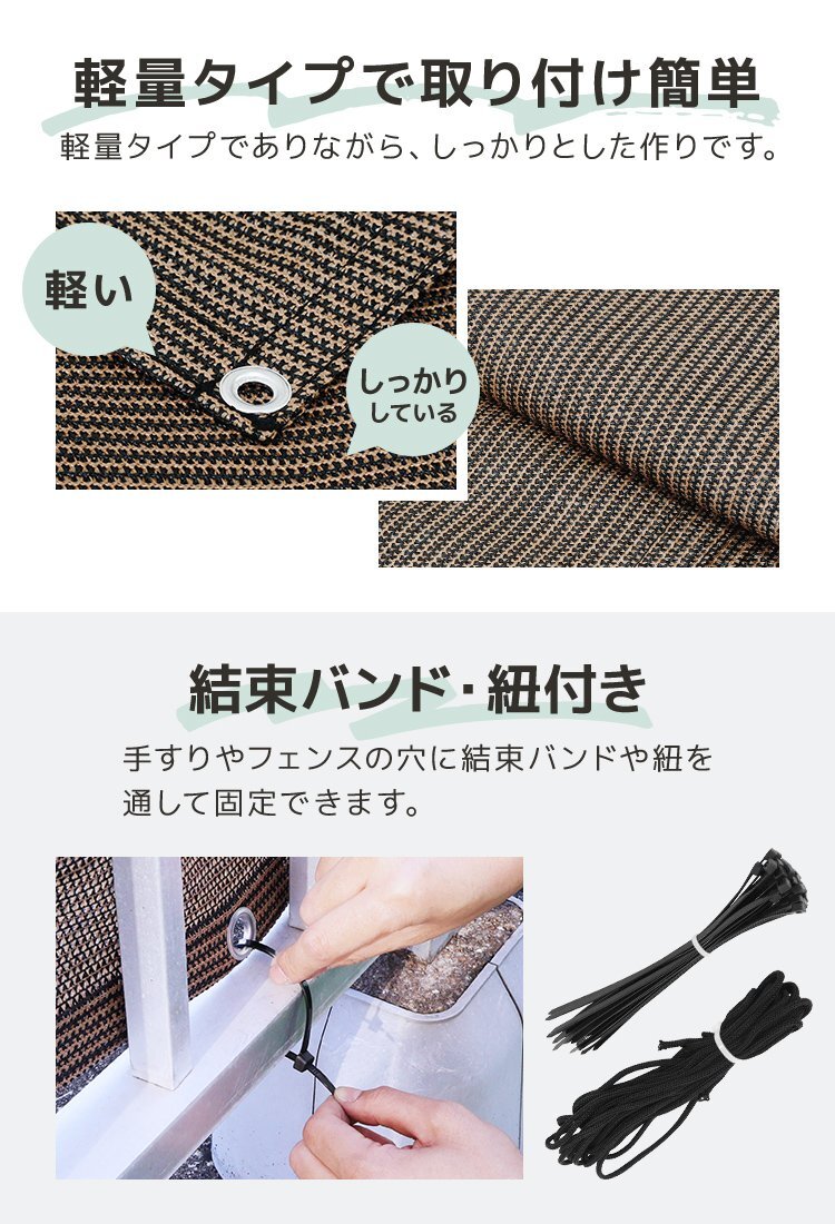 暑さ対策と目隠しにも最適な日除けシェードです。 ■風通しのいい通気タイプで快適 UVカット率90%以上&遮光率92%以上! 日差しをしっかりカット!室温上昇を抑制し、 通気性のある素材が風を通すので、快適に過ごすことができます。 ■目隠しにも最適 外からの気になる視線も遮り、プライバシーを守ります。 ■錆びにくいアルミ製のハトメ ハトメを多めに使用しているので、しっかり固定できて安全です。 縦にも横にも使えてピンっと張れます! ■軽量タイプで取り付け簡単 付属の紐や結束バンドを穴に通して固定するだけなので、取り付けも簡単♪ 【商品詳細】 カラー:モカ 材質:HDPE 付属品:ロープ(約160cm)×4本、結束バンド×30本 サイズ:約200×300cm |
