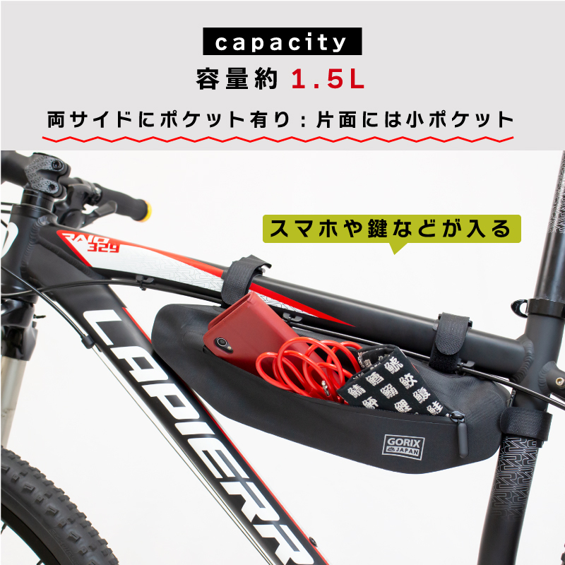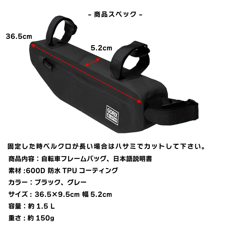 ロードバイクやクロスバイク、マウンテンバイクなどの自転車フレームに取付るフレームバッグです。 防水・耐久性に優れているので自転車通勤や通学、自転車配達などおすすめなサイクルバッグ。 自転車のフレームに綺麗にマッチ! 防水効果抜群なので急な雨も気になりません。 様々なフレームに合うようにベルト穴が複数あります。 [防水性] 表面全体に防水TPUコーティング加工。 ジッパー部分には水の侵入をガードする防水ジッパーを採用。 完全防水ではございません。 [耐久性] 分厚い600D素材・縫い線がないシームレス。 耐久性高く擦れや摩擦にも強くタフ! [容量約1.5L] 両サイドにポケット有り: 片面はノーマルポケット、片面には小ポケット サイクルにスマートフォンや鍵など、サイクルに必要な物を収納。 [ペダリングを邪魔しない] [中に安定板が入っているので型崩れしない・安定] 商品内容自転車フレームバッグ、日本語説明書 サイズ36.5×9.5cm 幅5.2cm 正味重量約150g 容量約1.5 L 材質600D 防水TPUコーティング 《ご注意》 ・商品は入荷によりキズがある場合があります。 ・保証対象外になりますのでご了承お願い致します。 ・ディスプレイ環境により実物と色が異なる場合が有ります。 ・入荷時期により予告無く一部仕様変更する場合が有ります。 |