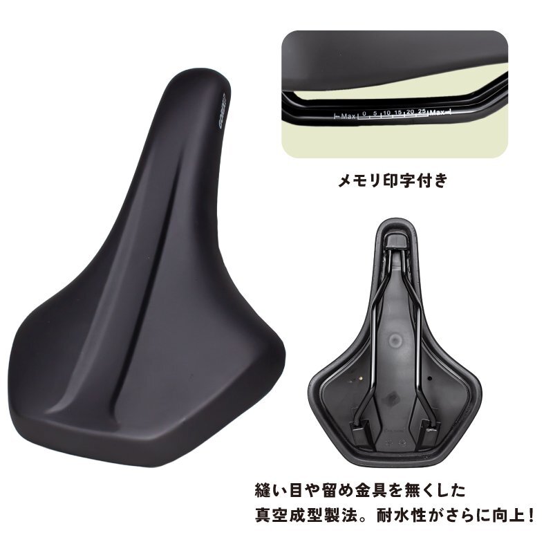 厚めのクッションで長時間座っていてもお尻の痛みがでにくいコンフォート性を重視したロングライド向きのサドルです。