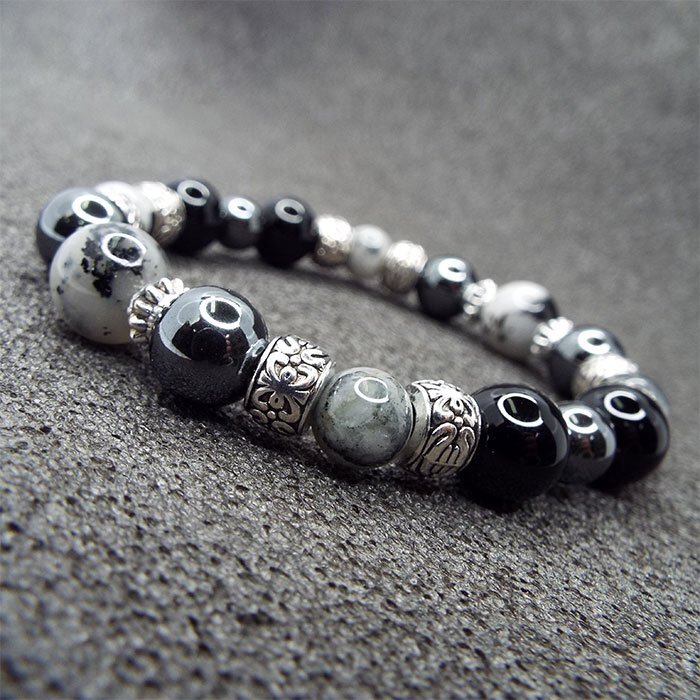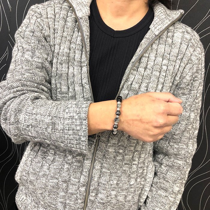 | 【STONE KITCHEN 天然石 パワーストーン】 ☆勉強運、仕事運、幸運・運気アップの魔よけ・厄除け・お守りブレスレット☆ ブラックルチルクォーツは直感力を高めるストーン!!! 人脈や仕事運に効果があります。 さらにブラックオニキスやヘマタイトを合わせて 悪運から身を守ってくれます♪ シンプルなデザインなので、時計やミサンガなど 重ねづけでの相性も抜群です♪ 誕生日やバレンタイン、クリスマス、父の日など 記念日のプレゼントやギフトにもおすすめです!! 内周:約17cm サイズ:ブラックルチルクォーツ 10mm・8mm ヘマタイト 10mm・8mm オニキス 10mm 1点 注意事項 ※金属部分は汗や汚れ等で変色する場合がございます。気になる場合は 金属磨きや布等で軽くふき取る事をおすすめします。 ※石の種類によっては、艶を引き出すことを目的として、ワックスや着色加工がされているものもあります。 ※表示のサイズは必ずしも最大値・最小値のサイズのものが入っているわけではございません。 ※天然石のため同じものでも色味・模様などが異なります。 ※照明の具合で実際とは色合いが異なる場合がございます。 また、天然素材特有のクラック・内包物を有する場合がございます。予めご了承下さい。 | |||