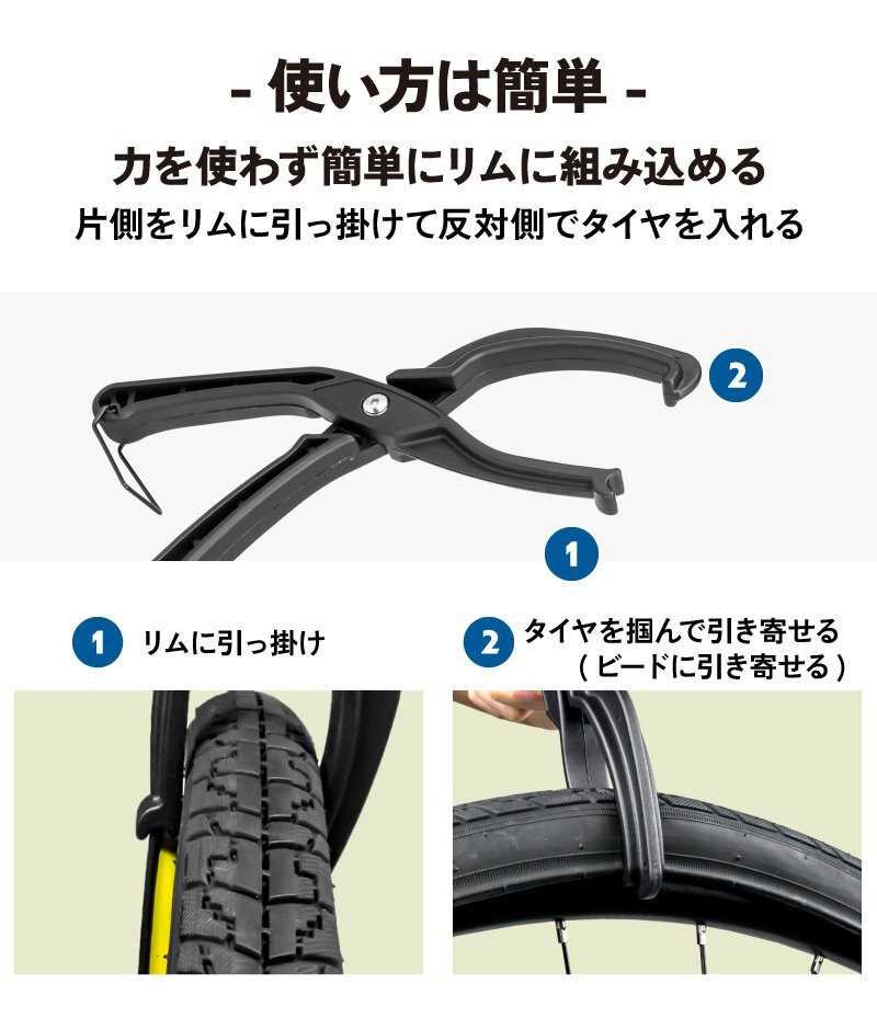 タイヤ交換の時に最後のタイヤはめ込みに苦労していた方や力ずくで手が痛い方におすすめの工具です。 タイヤの装着でしていた苦労もこの工具でなかった事に。これからは楽な作業に。 力を使わず簡単にリムに組み込める。 使い方は片側をリムに引っ掛けて反対側でタイヤを掴んでビードに引き寄せタイヤを嵌める。 自転車タイヤ取付け工具にはロック機能付き。収納しやすいロック機能で開きっぱなしにならなくて工具箱などにも収納しやすい。 また握りやすいグリップは凸凹が施してあり滑りにくくなっています。 自転車のタイヤ交換を楽にする工具です。 商品内容自転車タイヤ装着ツール サイズ全長約24cm 重量115g 材質ABS 適用タイヤ幅45mm/1.8インチ 未満の全タイヤ(ロードバイク、MTBなど)に適用。クリンチャータイヤ対応。 16インチの耐パンク仕様(ワイヤービード入り)のタイヤ装着も可能。 用途:自転車タイヤの交換、タイヤ装着 |