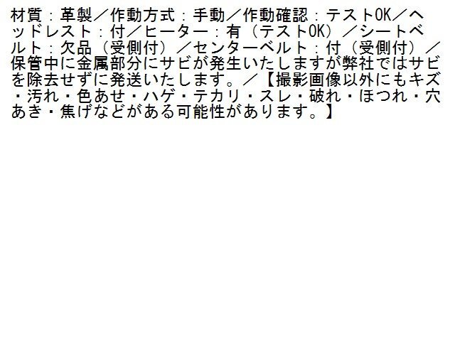 | 商品情報 | 材質:革製/作動方式:手動/作動確認:テストOK/ヘッドレスト:付/ヒーター:有(テストOK)/シートベルト:欠品(受側付)/センターベルト:付(受側付)/保管中に金属部分にサビが発生いたしますが弊社ではサビを除去せずに発送いたします。/【撮影画像以外にもキズ・汚れ・色あせ・ハゲ・テカリ・スレ・破れ・ほつれ・穴あき・焦げなどがある可能性があります。】 | ||