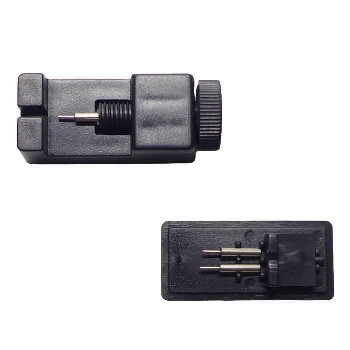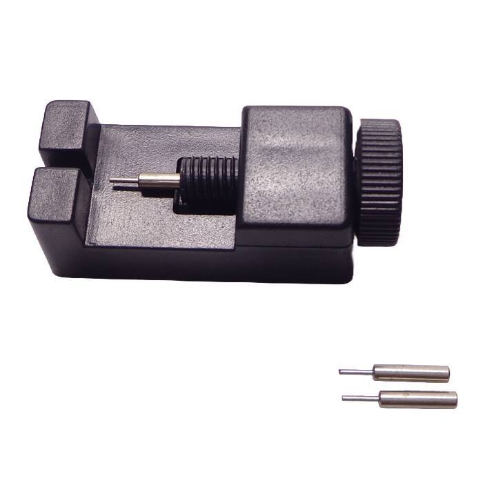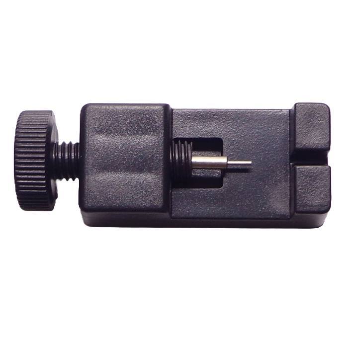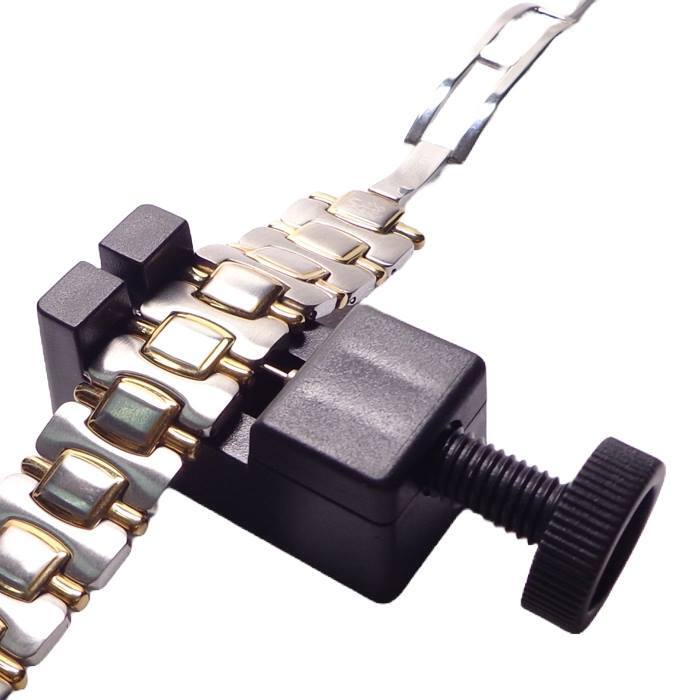 | ・金属ベルトのピンタイプに使用できます。 ・板ピン、ばねピン、ネジ式には、対応できません。 1)バンドの裏に矢印⇒がありますので(矢印がないモデルもあります)その方向にそってアジャスターのピンをバンド側面の穴に差し込みます。その状態でアジャスターのハンドルを回すと、ピンが押し出されコマが外れます。不必要なコマを同じ作業を繰り返し外してください。 2)本品とは関係がありませんが、 次に外したコマを組み合わせバンドの側面の穴に外したピンを差し込み、ピンの芯を完全に圧入すればコマが繋がります。 |