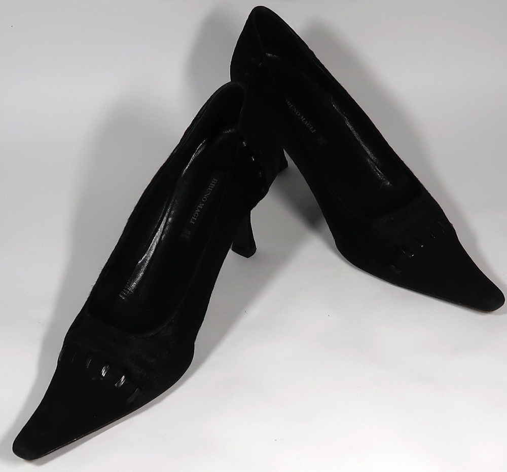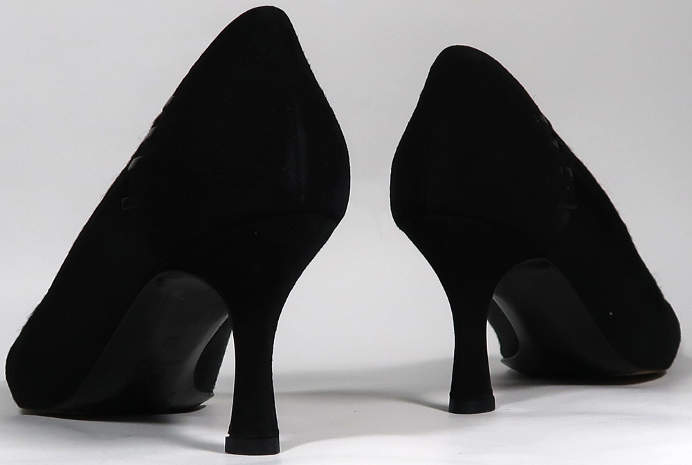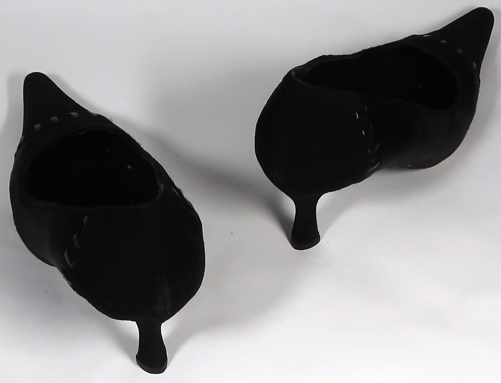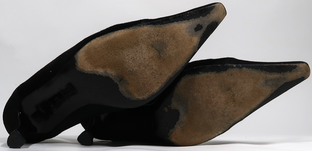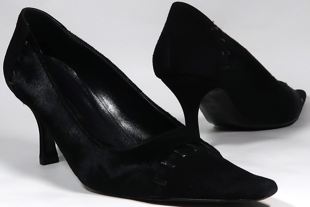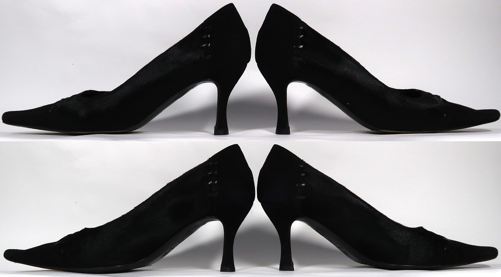 使用品ですので汚れや擦れあります。生地はつま先とヒール周りがスウェードです。中央付近の毛はハラコです。左足の中敷がほとんど剥がれていますので気になる方はご自分でボンドで貼付けてください。ヒールラバーは新しいのをつけてあります。ヒール高は7cmくらいです。