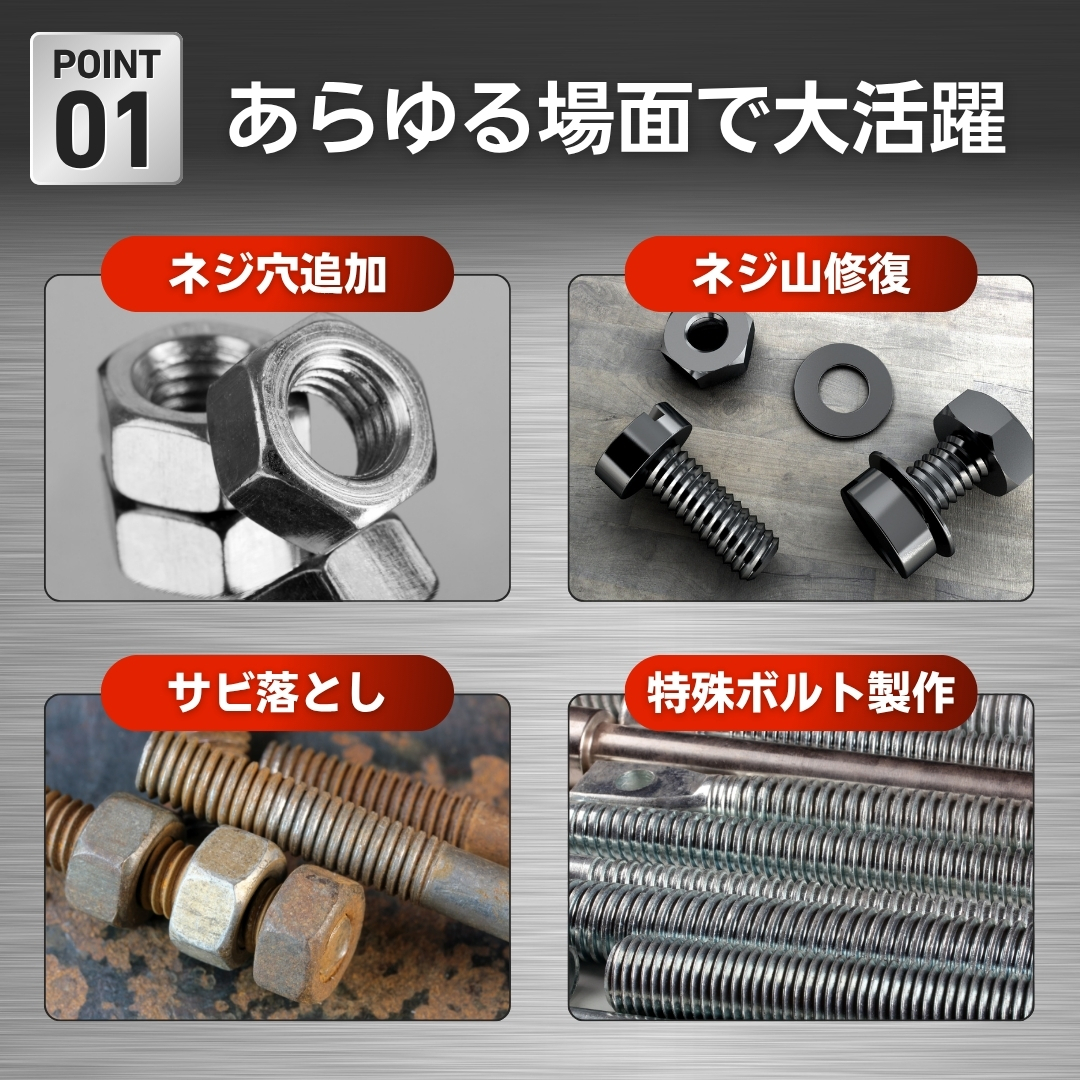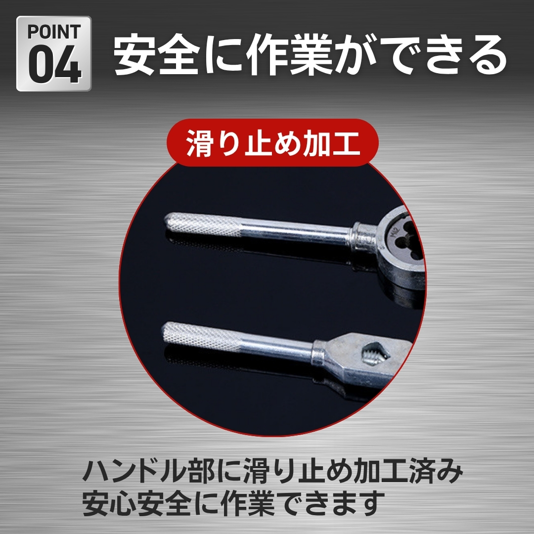 | 商品説明 | ご覧いただきありがとうございます。 ●商品説明 ネジ穴やネジ山の補修に便利なタップ&ダイスセットです。 ◎耐久性に優れたS45C材を採用 ◎JIS・ISO規格の並目ネジに対応 ◎ハンドル部は滑りにくい凹凸加工 ◎用途に応じた豊富なサイズをセット ◎切り屑が詰まりにくい排出溝付きで連続作業も快適 ◎専用ケース付きで整理や持ち運びがスムーズ ●使用例 ・錆びたネジ山の修正 ・オーバートルクでつぶれたネジ山の補修 ・新たなネジ穴の作成 ・スタッドボルトの製作 ※ステンレス鋼や熱処理済み金属には使用できません。 ●商品内容 <タップ 各1個> M3×0.5 / M4×0.7 / M5×0.8 / M6×1.0 / M7×1.0 / M8×1.25 / M9×1.25 / M10×1.5 / M12×1.75 <ダイス 各1個> M3×0.5 / M4×0.7 / M5×0.8 / M6×1.0 / M7×1.0 / M8×1.25 / M9×1.25 / M10×1.5 / M12×1.75 ・タップハンドル ×1 ・ダイスハンドル ×1 合計20PCS ※バラ売り・サイズ変更・数量変更などはできません。 ●商品仕様 ・材質:S45C(機械構造用炭素鋼) ・ハンドル全長:約195mm ・タップ:中タップ(直溝) ・ダイス:ソリッドタイプ(調整不可) ●使用方法 ◆タップの場合 加工物をバイスなどで固定する ハンドルにタップを取り付ける 加工面に切削油を塗布 垂直を保ちつつ2~3回転ねじ込み、食い付きを作る 時計回り3/4回転 → 半時計回り1/4回転 を繰り返してねじ切り ◆ダイスの場合 加工物を固定 ダイスをハンドルに装着し止めねじで固定 切削油を塗布 垂直に2~3回転回して食い付かせる 時計回り3/4回転 → 半時計回り1/4回転を繰り返してねじ切り ※切削油の使用は仕上がりや工具寿命に大きく影響します。必ずご使用ください。 ※力を入れすぎると破損の原因となりますのでご注意ください。 ●お支払い方法 !かんたん決済 ●発送について 【クリックポストで発送します】 発送日 :お支払い後1~3日以内 到着目安:発送後2~4日程度 ※商品はポストに投函されます ※遠方の方はもう少しかかる場合もございます 【配送方法の変更はできません】 ●注意事項 ・落札後は期限内にお支払いください ・商品画像の転載や説明文のコピーはお止め下さい 〇初期不良は対応しますので、何かあれば「取引完了前に」ご連絡下さい |