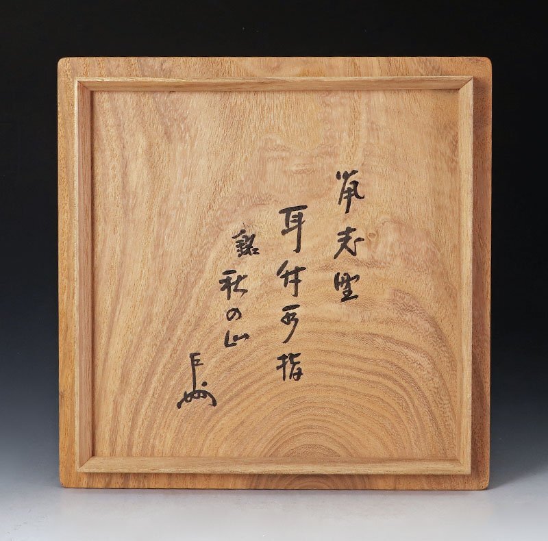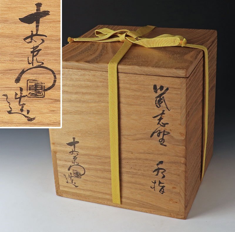 【加藤十右衛門】 1894年(明治27年)12月21日 - 1974年(昭和49年)10月15日。日本の陶芸家。岐阜県土岐郡笠原町(現・多治見市)生まれ。八坂窯開窯。美濃大平の陶祖加藤景豊(加藤五郎衛門景豊)の流れをくむ。1927年には笠原町の町長を務める。1958年に岐阜県の無形文化財保持者に認定。美濃桃山陶芸に魅力され伝統技法をベースに、志野、黄瀬戸、織部、美濃伊賀などを手掛けた匠。戦後の美濃陶芸再興復元に尽力。1974年、79歳で死去。 【即中斎 表千家13世家元 無盡宗左(無尽宗左)】 12世敬翁宗左の二男であったが長男が早死であった為、1937年に家元を襲名。その後、 42年に同門会(後75年に社団法人表千家同門会)を発足させ機関紙を発行するなど現代茶の湯の発展に尽力、70年に は日本全国に支部を持つようになり、また海外においてもハワイ、ロスアンゼルス、サンフランシスコを拠点に普及活動を進める。 |