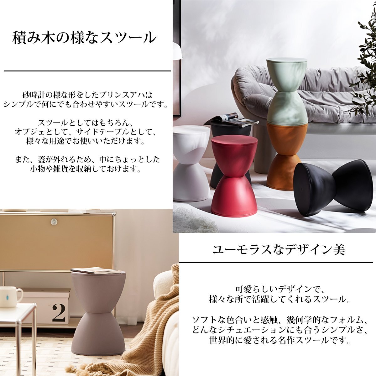 ![]() 積み木のようにカラフルなスツール 砂時計のような形をしたプリンスアハはシンプルで何にでも合わせやすいスツールです。 スツールとしてはもちろん、オブジェとして、サイドテーブルとして、様々な用途でお使いいただけます。 また、蓋が外れるので中にちょっとした小物や雑貨を収納しておくことができます。 スツールですが、小ぶりなサイドテーブルとしてもピッタリなサイズ感。 軽量設計で、女性も片手で軽く持ち運びしやすいのも魅力。 小さく可愛らしいサイズ感ですが、大人の男性が座っても安定感はバッチリ。 リビング、玄関先や洗面スペース…、色んな場所で大活躍! プリンスアハは色々なところで活躍してくれる使い勝手の良さも人気の秘密。 リビングでサイドテーブル代わりに使ったり、観葉植物を置く台として使ったり。 玄関先にひとつあると、 靴を履く時や、手荷物をちょっと置く場所としても重宝します。 洗面室に置いて、ドライヤー中やスキンケア中に腰かけたりするのにも便利です。 プリンスアハはKartellでも多くのアイテムを手がけている、 フィリップ・スタルクのデザインです。 スタルクの革新的で見る者をうっとりさせる造形美が光る一作になっております。 ■商品仕様 サイズ(約):幅30×奥行30×高さ44cm 素材:PP製 重量(約):1.7kg デザイナー:Philippe Starck/フィリップ・スタルク |