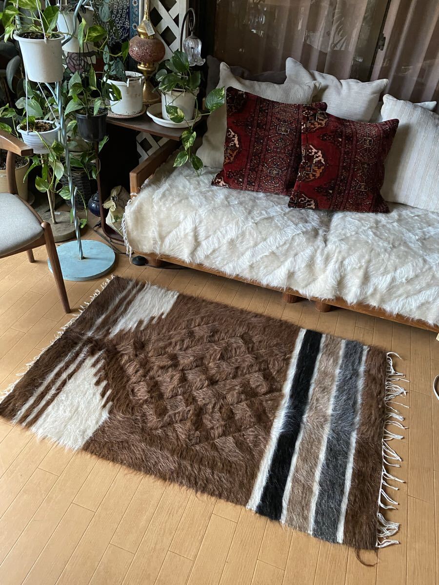 冬は毛がある面で、夏は裏面でキリムとしてお使いいただける優れものです。 また毛のある表は毛をけばだたせて、模様も作っていますのでとてもおしゃれ度が高いです。新品未使用品です。