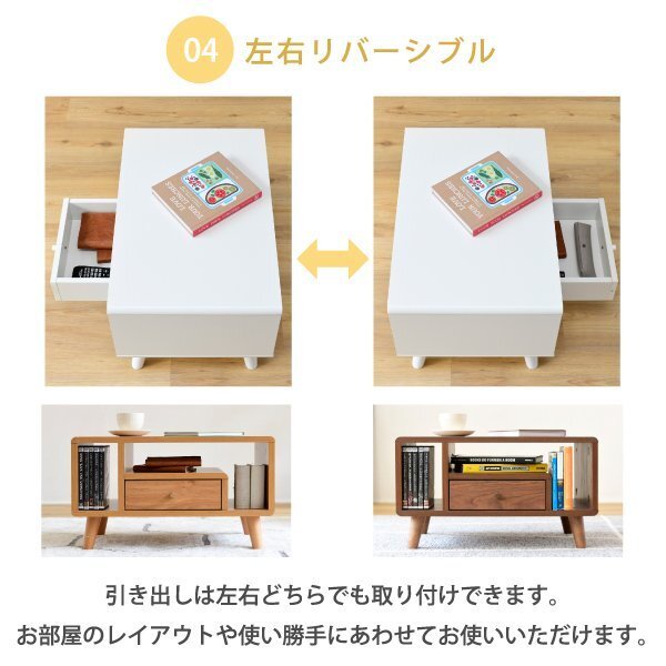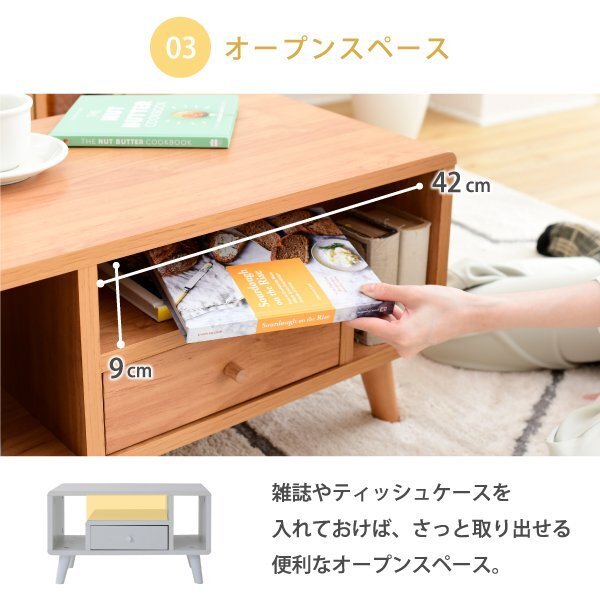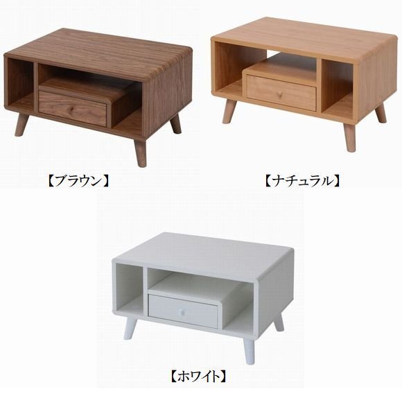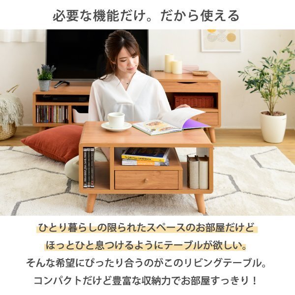 | 収納するものから設計されたデザインだから、コンパクトでも機能的。 リビングテーブルとしての機能だけでなく、DVDやティッシュ、雑誌が収納できるオープン部、リモコンなどを収納できる引き出し付き。 丸みのある北欧風のデザインはとてもおしゃれで、ひとり暮らしのお部屋にもぴったりです。 |