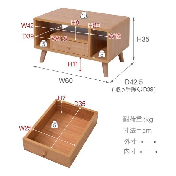 | 【カラー】 ブラウン、ナチュラル、ホワイト 【サイズ】 <外寸> 幅60×奥行42.5×高さ35cm <内寸> オープン部:幅12×奥行39×高さ20cm L字オープン部:幅42(11.5)×奥行39×高さ9(20)cm 引き出し:幅25×奥行35×高さ7cm 脚元空間:高さ11cm 【材質】 本体:プリント紙化粧繊維板 脚:天然木 【耐荷重】 天板:(約)10kg以下 オープン部:各(約)5kg以下 引き出し:(約)5kg以下 【生産国】 マレーシア 【梱包】 サイズ:68×44×16cm、重量:14kg 【その他】 ・六角レンチ同梱 ・背面化粧有り ・脚は天然木を使用しているため、商品によって色味や木目などの風合いが異なります。 ・脚裏フェルト付き 【組み立て品】 お客様による組み立てが必要です。 【ご注意】 ・サイズ、重量は概算です。 ・商品カラーはご使用のモニターによって実際の明るさや色と異なって見える場合がございます。 |
