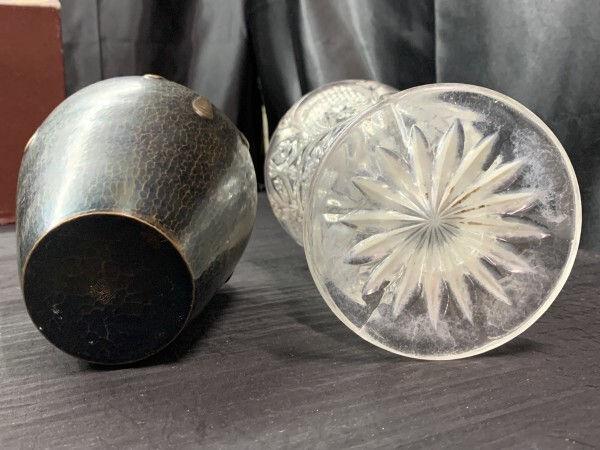 | 商品状態の備考 | ・銅器の外箱フタ内側に記名あり(画像参照) ・ガラスの製品は本体くすみがひどく、外箱も状態悪いです ・画像はわかりにくいですが角度を変えて撮影したものです ・バラの一輪挿しは約20cmでした 譲渡品のため詳細不明。 銘柄や状態は画像にてご判断ください。 長期保管品のため経年による劣化(特に外箱)や破損が見られる場合がございます。 交換もできかねます。 簡単な清掃を行った現状お渡しとなりますので、慎重にご検討されたうえ、お求めください。 ※ノークレームノーリターンでお願い申し上げます。 |