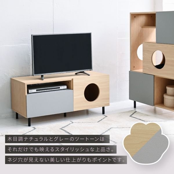 | 大切な猫と楽しく過ごせる猫家具シリーズ”Pisica”。 リビングで猫がゆったりとくつろいでいる様子が楽しめるテレビ台です。 覗き穴から愛猫の寝姿が見られます♪ |