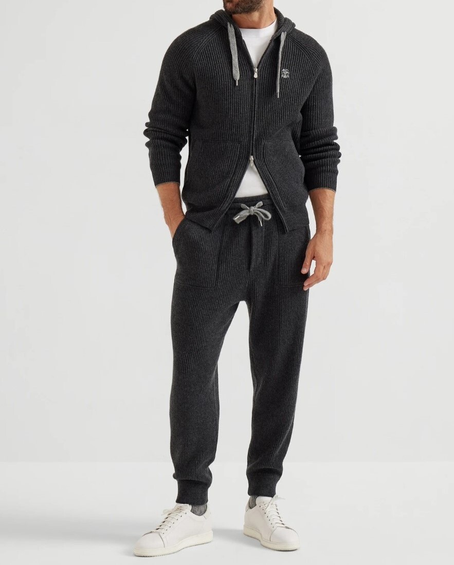 ブルネロクチネリの『カシミア100% イングリッシュリブ編み ニットパンツ』。