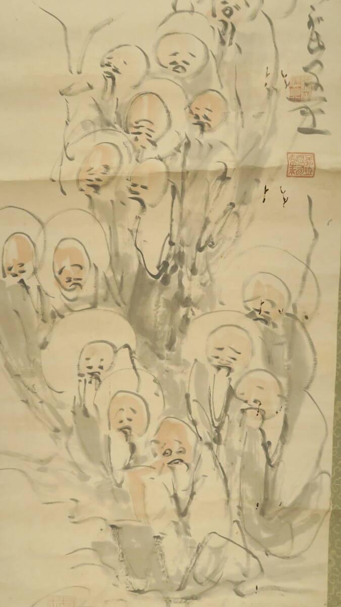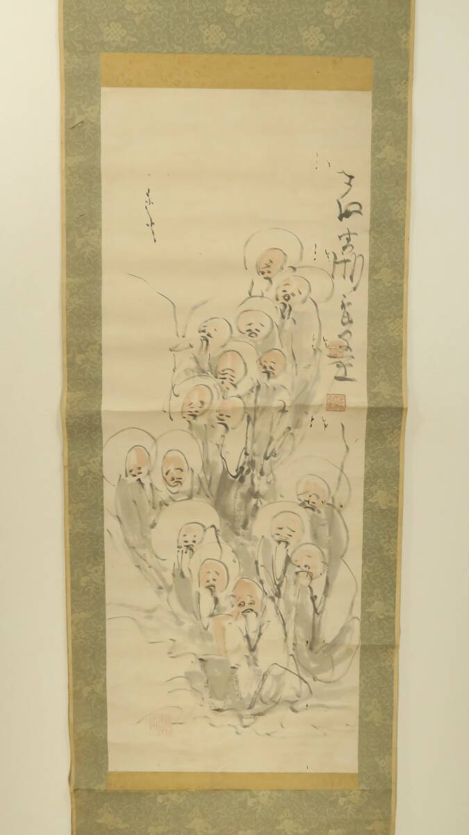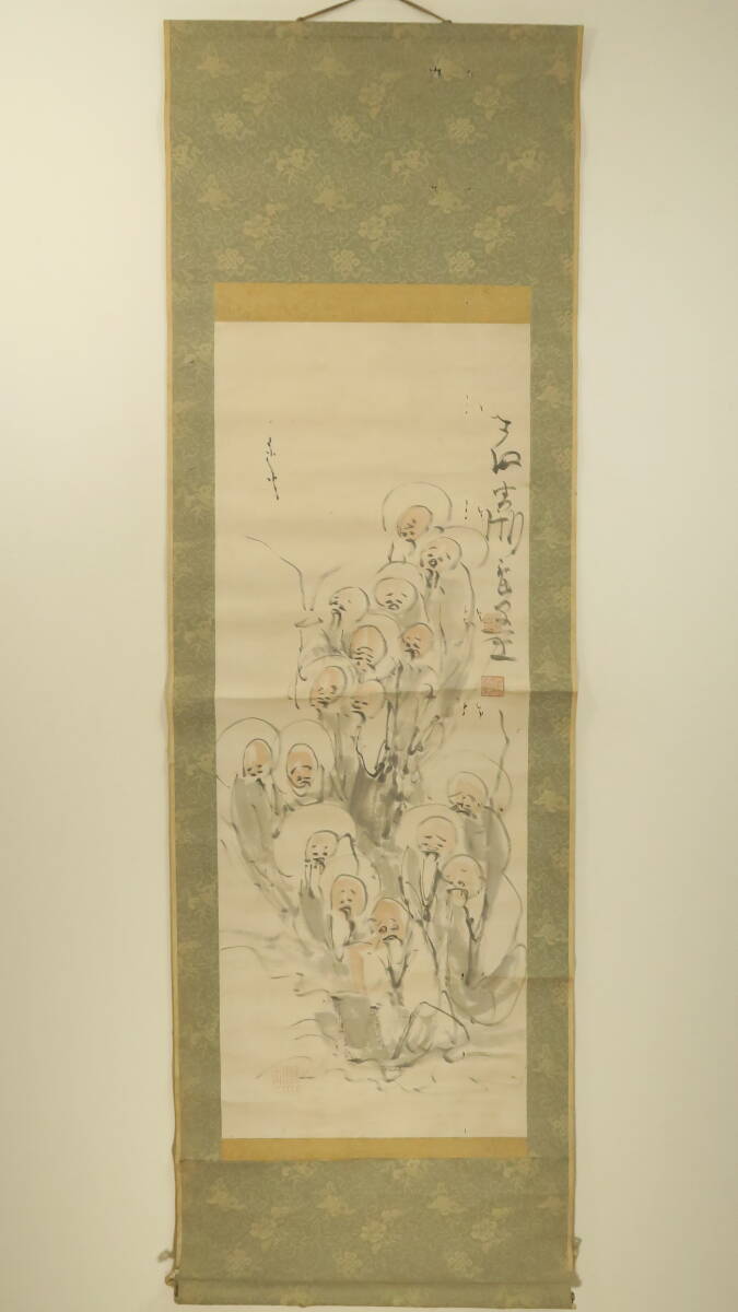 ●商品説明/奥原晴湖画(肉筆)・「十六羅漢図」【真作】。奥原晴湖は、1837-1913 幕末-明治時代の日本画家。天保(てんぽう)8年8月15日生まれ。下総(しもうさ)古河(こが)藩(茨城県)家老池田政明の4女。枚田(ひらた)水石にまなび,江戸にでて,清(しん)(中国)の画家費(ひ)晴湖に傾倒し,東海晴湖と号した。安田老山とともに明治初期の代表的な文人画家。明治24年埼玉県熊谷に隠棲。大正2年7月28日死去。77歳。本名は節。号ははじめ雲錦。作品に「月ケ瀬梅渓図」など。●本紙(紙本)寸法;縦125㎝×横47.5㎝。軸寸法;縦193㎝×横61.5㎝。明朝仕立。オレ、浮き。軸棒無し。虫喰い。●ご入札宜しくお願いいたします。※万が一【真作】でなかった場合、返品承ります。※落札後の値段交渉には応じかねますので、ご了承ください。
