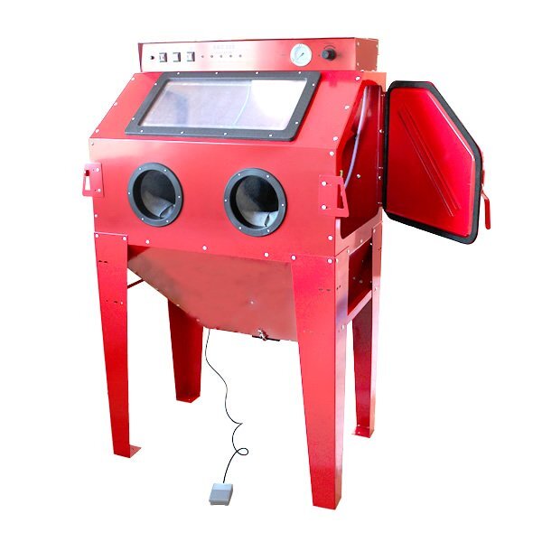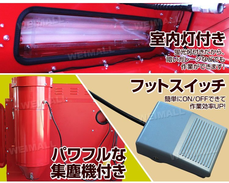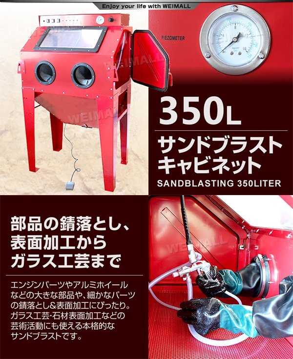 容量350リットル 大型サンドブラストキャビネット サンドブラストで錆びついた部品、 特に奥まった形状で手が入らない部分等の錆落とし、表面加工にもってこいの1台です!! アルミホイールやエンジンブロック等のブラスト最適です。 排出口があるので無駄なく連続作業が可能です。 庫内は蛍光灯内蔵で明るい!暗いガレージでも快適に作業ができ、大変便利! 大きなサイドドアがついているため、大型パーツの出し入れがカンタンです! |