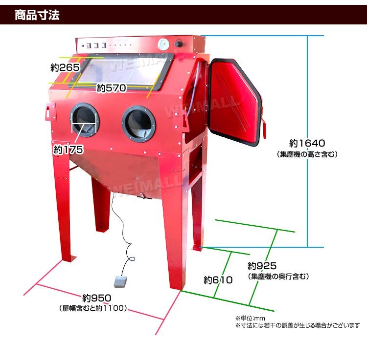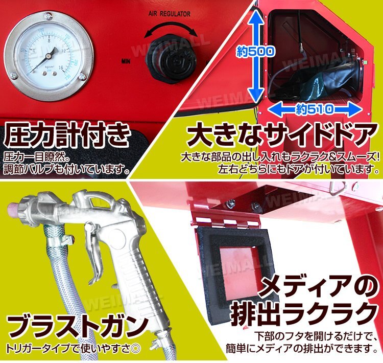 商品コード:A17E350L ■商品仕様 容量:350L 本体サイズ(約):幅950×奥行925×高さ1640mm 扉サイズ(約):幅510×高さ500mm(両開きタイプ) 入力:コンプレッサーエアー 使用空気圧:6~8kgf/cm2 蛍光灯:AC100V(50/60Hz) コード(約):1.6m 標準サンド使用量:10~30kg 重量(約):90kg フットスイッチ付き 圧力計付き 集塵機付き ■商品内容 本体 ブラストガン ノズル 保護グローブ 保護フィルム 英語版取扱説明書 ■保障期間 30日間 ※商品到着後30日以内の初期不良・破損のみご対応させていただきます。 ■注意事項 ※代引き不可です。 ※本品のみでは作動いたしません。本品を使用するためにはエアーコンプレッサー等が別途必要になります。 ※海外からの輸入製品となりますので、製造、または配送の過程において生じた、細かなキズやへこみが見られる場合がございますが、機能性や品質上に問題はないため、返品や交換の対象とはなりません。予めご了承の上、ご購入をお願いいたします。 ※商品を使用して発生した事故・トラブル・破損等につきましては一切の責任を負いかねます。 ※商品は、モニターによって色合いが異なって見える場合があります。 ※仕様・デザインは改良のため予告なく変更することがあります。 【もちろん新品未使用品です】 |