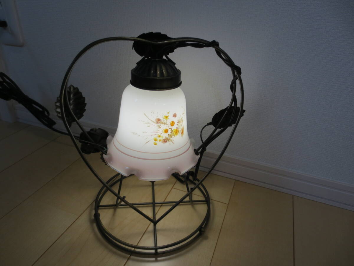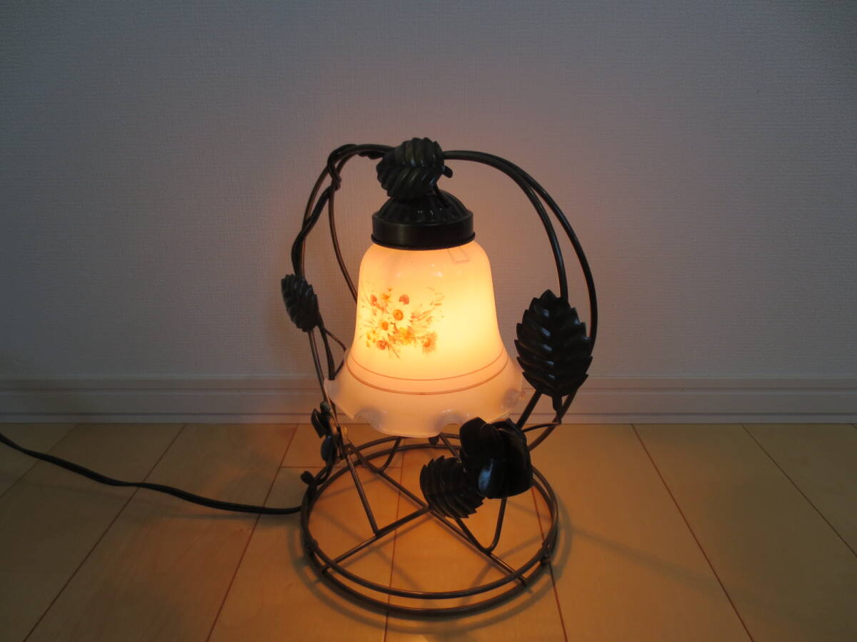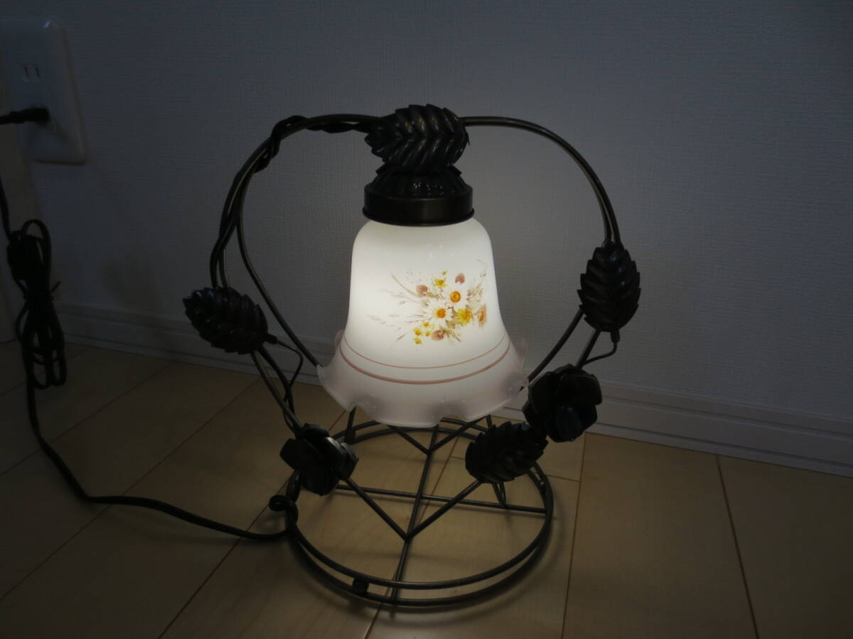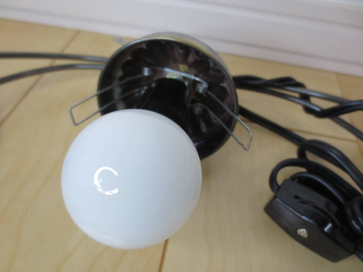 元々付いている白熱球の他にLED(昼白色)をお付け致しますので、2種類の灯りをお好みでどうぞ!白熱球はすごく熱くなりますので、やけどに注意してください。高さ約30センチ。取付はバネをつまんで笠の奥まで入れて放してください。