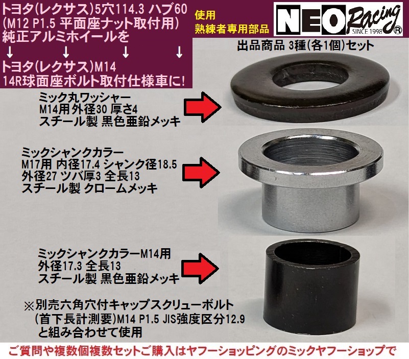 | トヨタ(レクサス)5穴114.3 M12 P1.5 平面座ナット取付用純正アルミホイールハブ60をトヨタ(レクサス)5穴114.3 M14 P1.5 14R球面座ボルト装着仕様車に取付ける為の座面形状変換部品(別売:工業規格 強度区分10.9・12.9のM14R1.5の六角穴付キャップスクリューボルトと組合わせて使用)の1穴分3種セットです。 シャンクカラー「M17用内径17.4シャンク径18.5」と「M14用外径17.3」は公差において相性ありますので本セットでのご購入お勧めします。 ※2枚目画像(構造・注意事項)で理屈理解できない方のご注文はご遠慮下さい。 ★注意 2枚目画像近日訂正予定 画像の計算式に加算必要 注文者様計測要『自動車ハブのネジ掛かりはじめの奥行き何mmからか?』を 加算しての首下長のキャップスクリューボルトが必要です | |