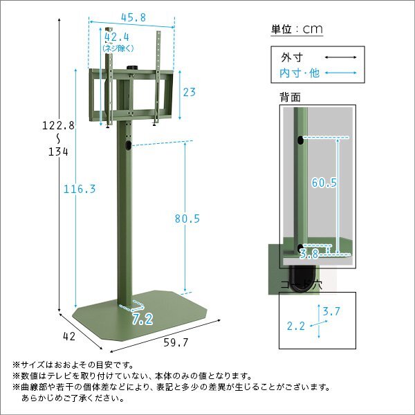 【カラー】 ブラック、グリーン、ピンク、ホワイト 【サイズ】 テレビスタンド:W59.5×D42×H122.8-134cm HDDホルダー:W15×D6.1×H10cm 【重量】 テレビスタンド:17kg HDDホルダー:0.2kg 【素材】 スチール 【梱包】 テレビスタンド サイズ:W117×D45.2×H10cm、重量:18kg HDDホルダー サイズ:W17×D8×H12cm、重量:0.25kg 【組み立て品】 お客様による組み立てが必要です。 【ご注意】 ・サイズ、重量は概算です。 ・商品カラーはご使用のモニターによって実際の明るさや色と異なって見える場合がございます。 |