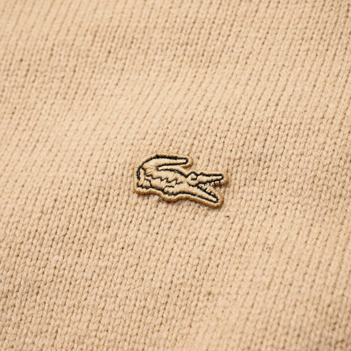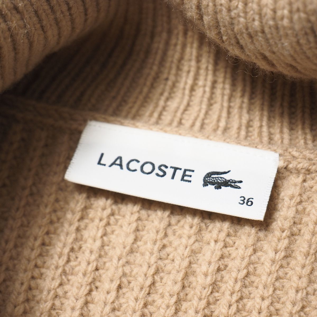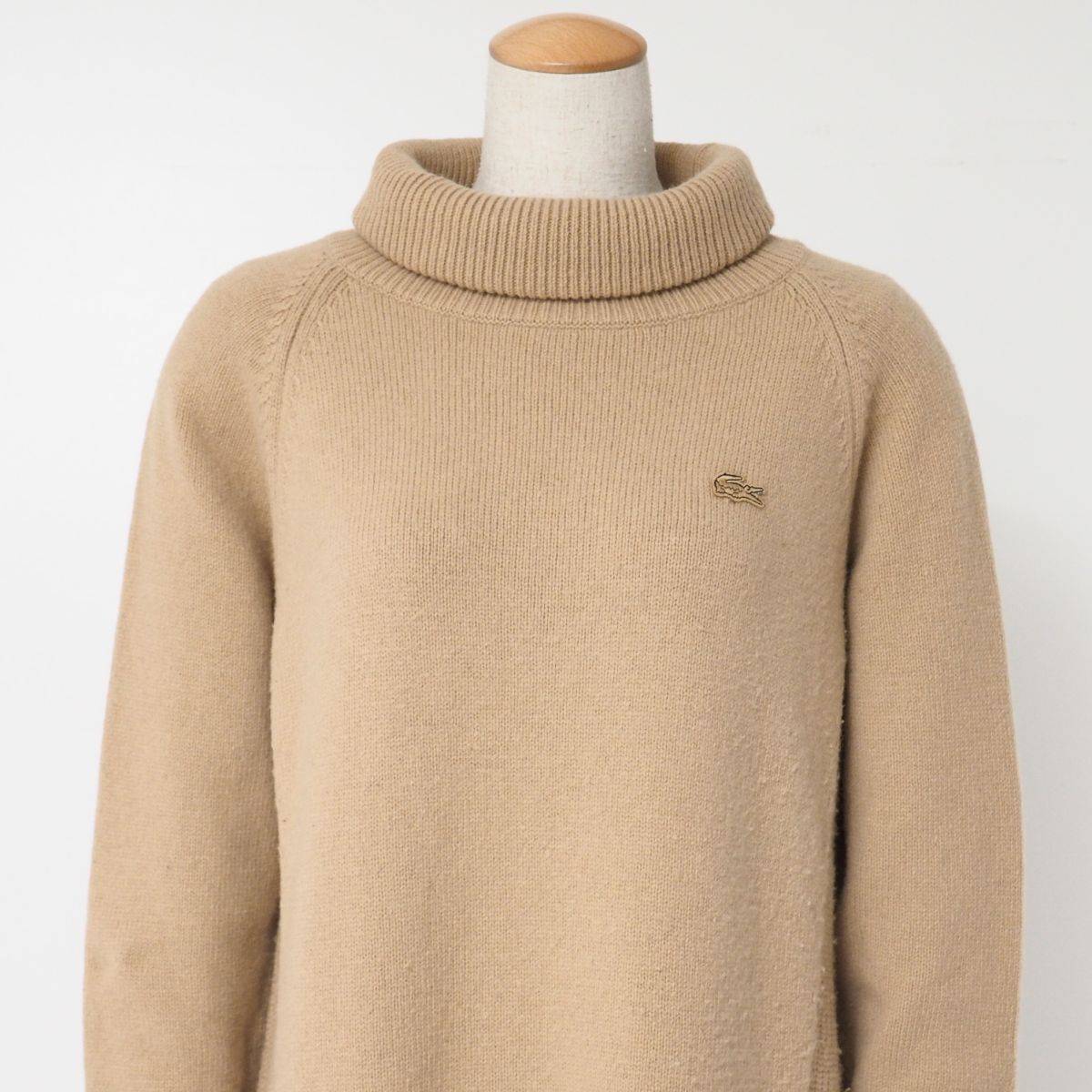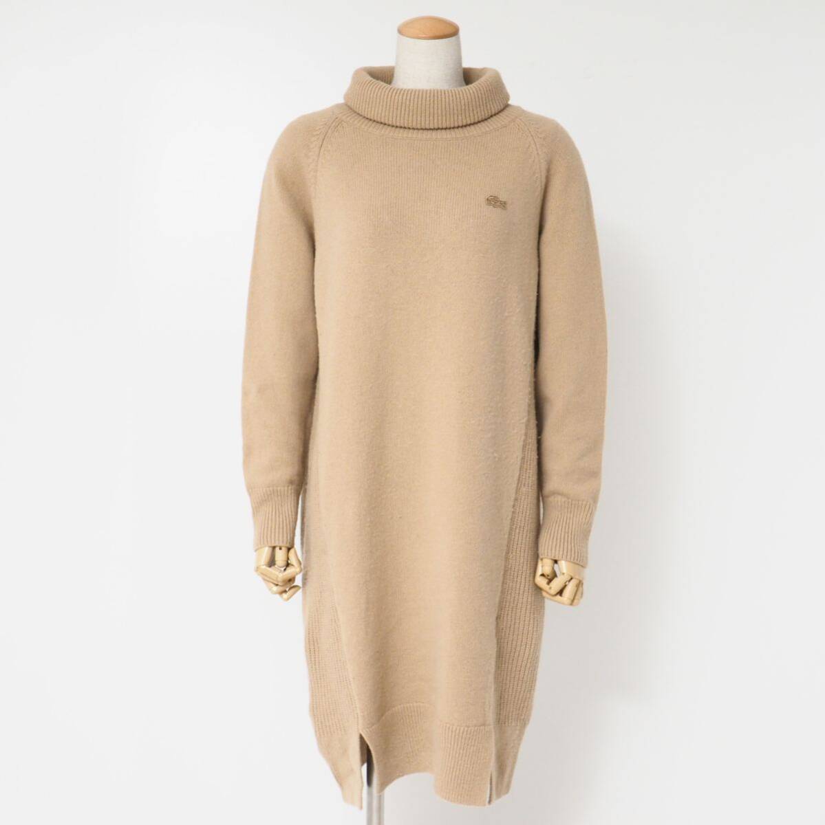 | TI6882☆ラコステ LACOSTE ニットワンピース タートルネック 長袖 プルオーバー ワンポイント ベージュ サイズ36 | |||