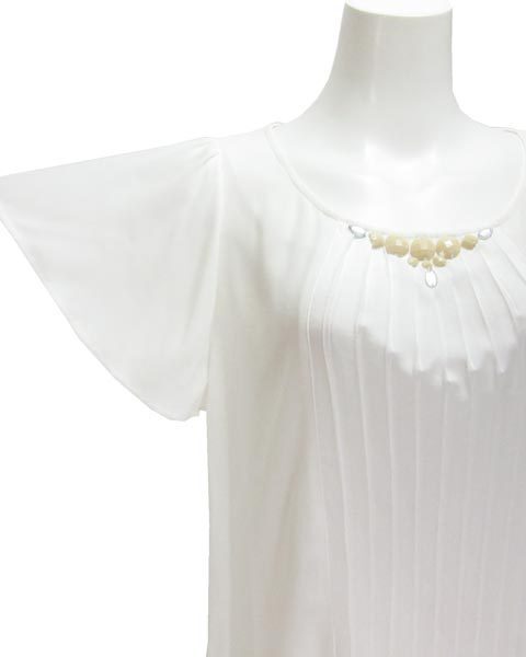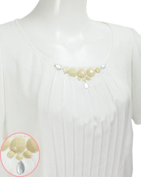 | シンプルデザインで着回しの効くブラウス。首周りにお大き目ビジューがついていて、華やかな雰囲気。フロントにはプリーツが入っているので、ゆったりとしたシルエットです。お袖がエアリーなシフォン素材で可愛いデザイン。 |