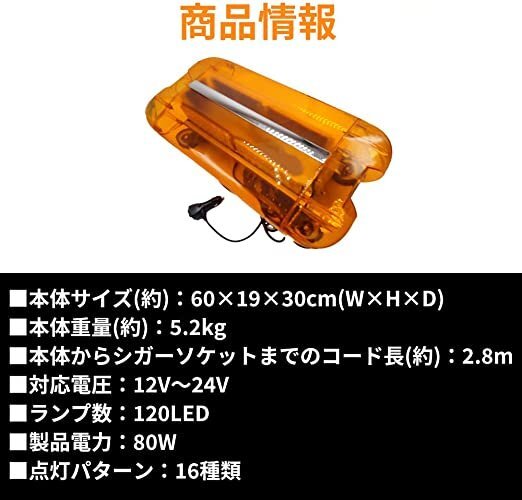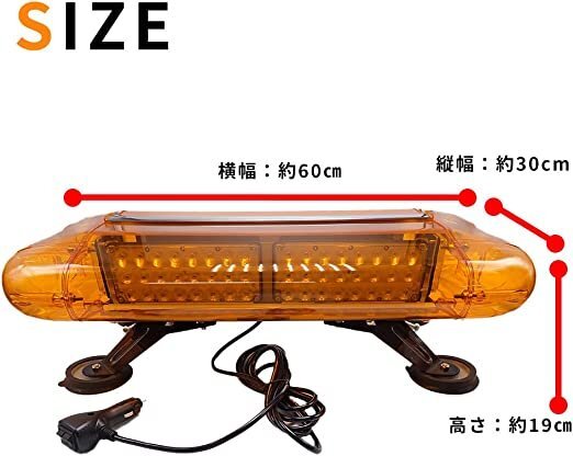 | 商品説明 | 〇60×19×30サイズのLED回転灯です。 〇シガーソケット電源のため、手軽に使用することができます。 〇左右と正面合わせて120個のLEDを使用しているため、とても明るく遠くまで照らすことができ、視認性抜群です。 〇発光パターン切り替えスイッチを押すことで16パターンの発光パターンに切り替わります。用途に合わせて切り替えてご使用ください。 〇商品詳細 ■本体サイズ(約):60×19×30cm(W×H×D) ■本体重量(約):5.2kg ■本体からシガーソケットまでのコード長(約):2.8m ■対応電圧:12V~24V ■ランプ数:120LED ■製品電力:80W ■点灯カラー:アンバー ■点灯パターン:16種類 ※電源を入れてもライトがつかず、点滅を一定ごとに繰り返す場合は電源の電力が足りていない可能性があります。