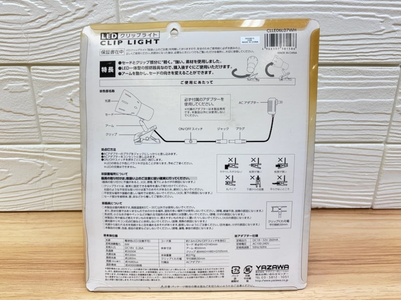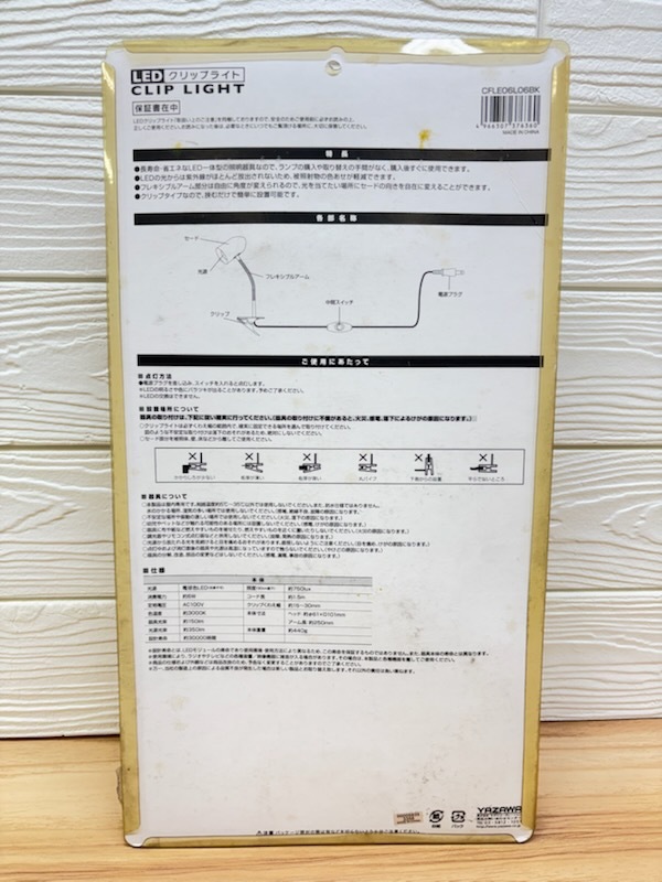 マスター入数 12 インナー入数 1 パッケージ重量 約580g パッケージ寸法 W225mm×H420mm×D70mm 包装形態 スライドブリスター [特徴]●スタンドライトを置くスペースがない場所でも、挟むことができれば設置することができます。●LEDを組み込んだクリップライトです。別に電球を購入する必要はありません。すぐにお使いいただけます。●アーム部分は自由に曲げることができるので、好きな場所に光を当てることができます。