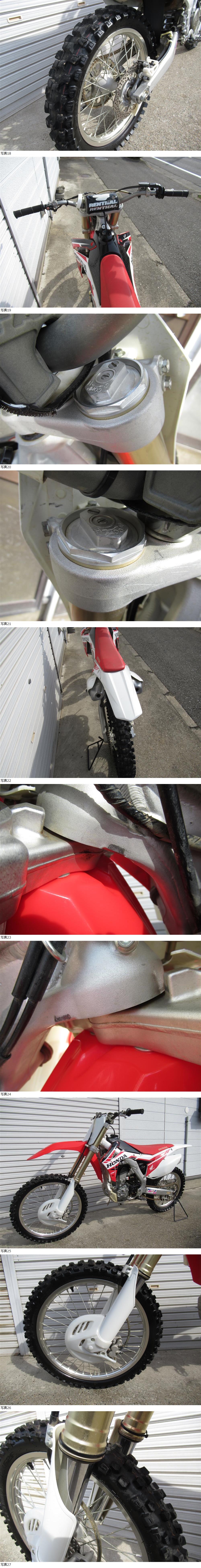 | 商品説明 | ホンダ CRF250R の出品です☆ エンジンの始動動画も下記にありますので、ご検討中の方はよければご確認ください。☆ 商品詳細 メーカー:ホンダ 車名:CRF250R 年式:2014年 車体番号:ME10-200※※※※ 登録書類:無 エンジン;実動 状態:現状車 ※動画のセンタースタンドは撮影用のため付属しません。三角スタンド付属 ☆☆☆CRF250R エンジン始動動画はこちら☆☆☆ ☆☆☆CRF250R エンジン始動動画はこちら☆☆☆ ※動画はグーグルでパソコンでご確認ください。 エンジンは動画でキック1発始動してます。☆ 動画のように気持ちよくふけあがります。☆ 狭い敷地内で走る止まる曲がる確認済みです。☆ 全体的に、傷、小錆、汚れなどはありますのでご理解できる方のみご検討ください☆ かんたんにしかチェックしていません。現状有姿渡しでの出品になります。乗車前に点検整備お願いします☆ コンペティションモデルのためノークレーム商品です。☆ |