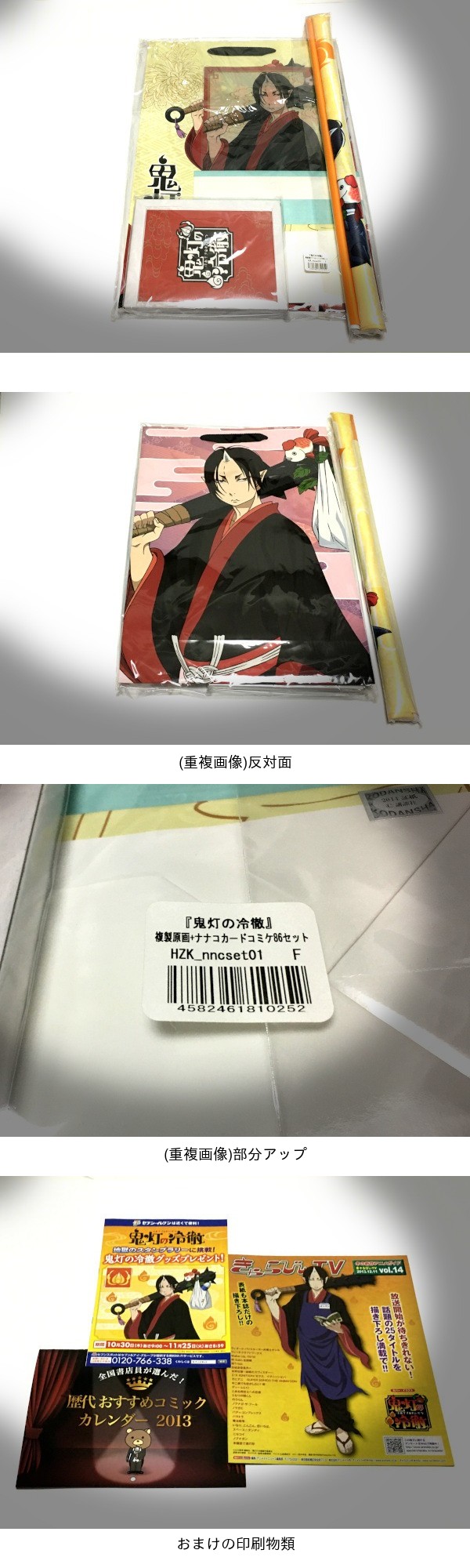 | ------------------------------------------------------------------------ ж ж ж 商品について ж ж ж ------------------------------------------------------------------------ ◆ 鬼灯の冷徹 コミックマーケット86セット ・ 描き下ろしイラストの 複製原画 ・ オリジナル nanacoカード ・ 描き下ろしイラストの クリアファイル ・ 描き下ろしイラストの タペストリー ・ 描き下ろしイラストの 紙袋 購入時のビニールパッケージのまま 未開封の為、 中身の詳細な仕様・状態については不明です。 パッケージには スレ、シワ、折れ、などがあります。 ◇ ( おまけ ) 当時の配布印刷物 ・ 当時のセブンイレブンのイベントなどのチラシ ・ きゃらびぃTV 2013 vol.14 ・ 全国書店員が選んだ!歴代おすすめコミックカレンダー2013 おまけは、いずれもタイトルの商品とは関係ありませんが、 鬼灯の冷徹関連が 掲載されています。 タイトルの商品・おまけとも 入手より かなり経年しており、記載以外にも 初期、経年 による劣化、及び 保管時、取り扱い時などのダメージ必至です。 ※ 商品は この商品説明の画像1枚目、4枚目、のもので全てです。 ※ 自身が 当時 新品で購入 及び 入手した ワンオーナー品です。 ※ 画像は 実物よりきれいに写ってしまう部分があります。 また、最初の検品・出品から 時間が経っているものは、掲載画像・説明にはない 劣化 及び ダメージの増加 など 必至です。商品状態は現物優先です。 ※ ペットなし、非喫煙環境です。 |