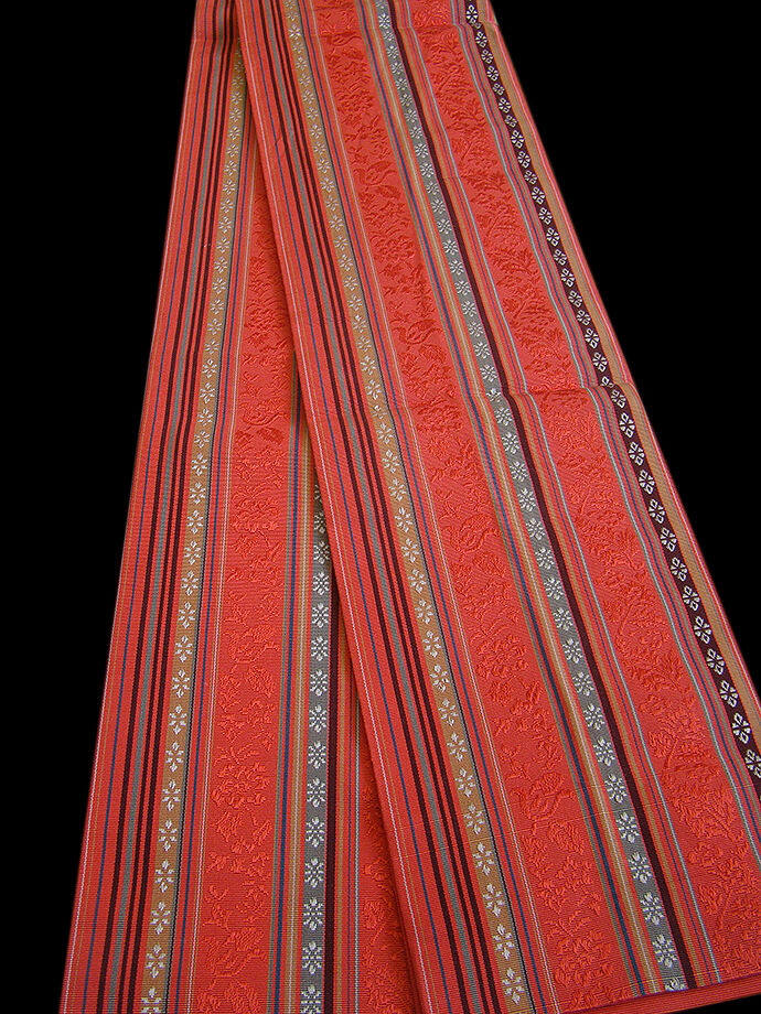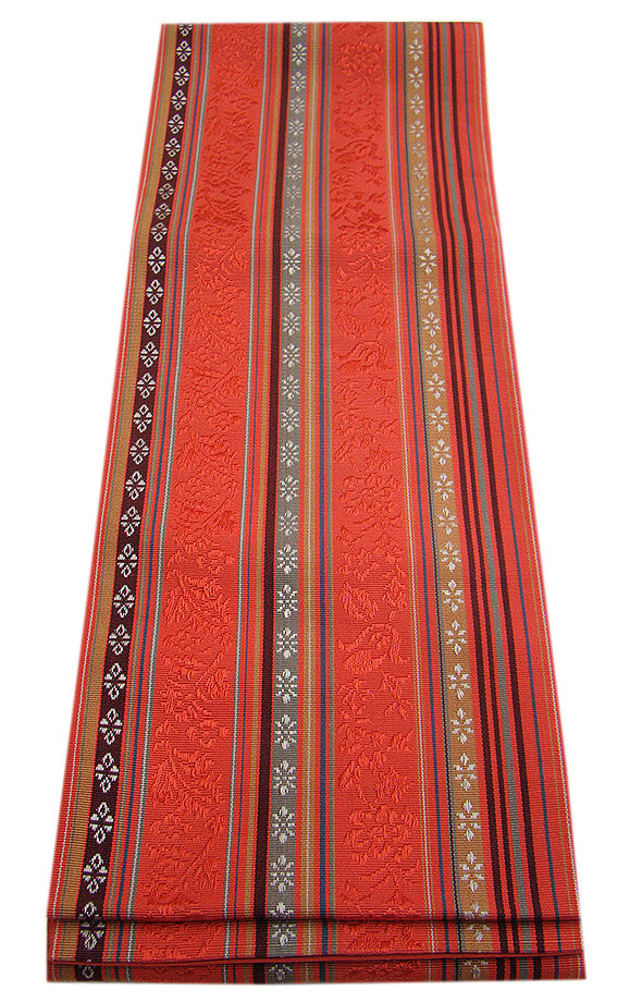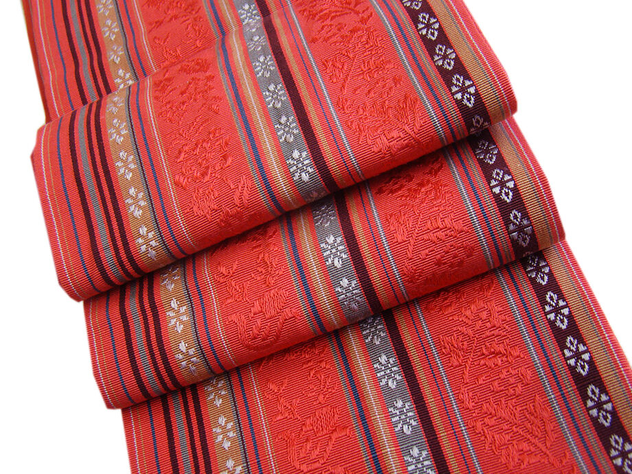 | 商品説明 | しなやかな手触りのしっかりとした博多織の四寸小袋帯。 朱赤色地に海老茶、藍鼠、茶鼠、金茶色等の縞に花草柄の織柄。 裏地は朱赤色の無地。 |